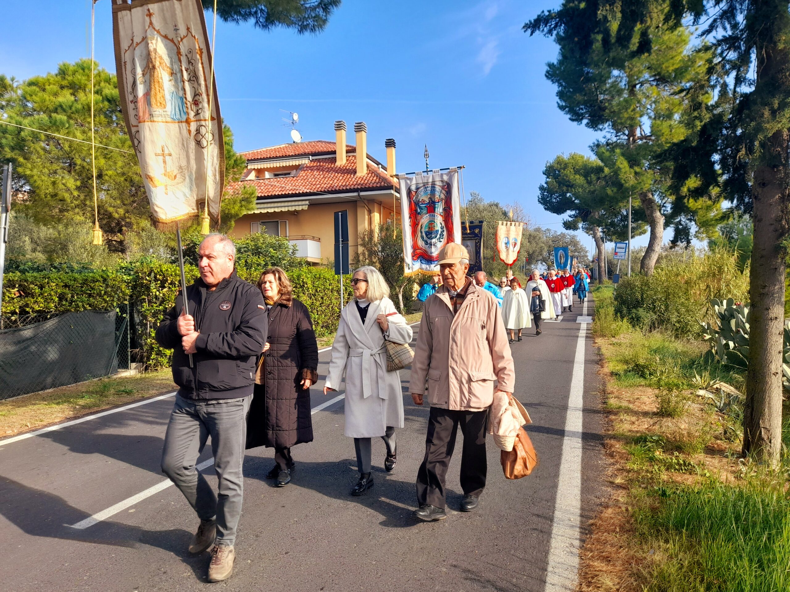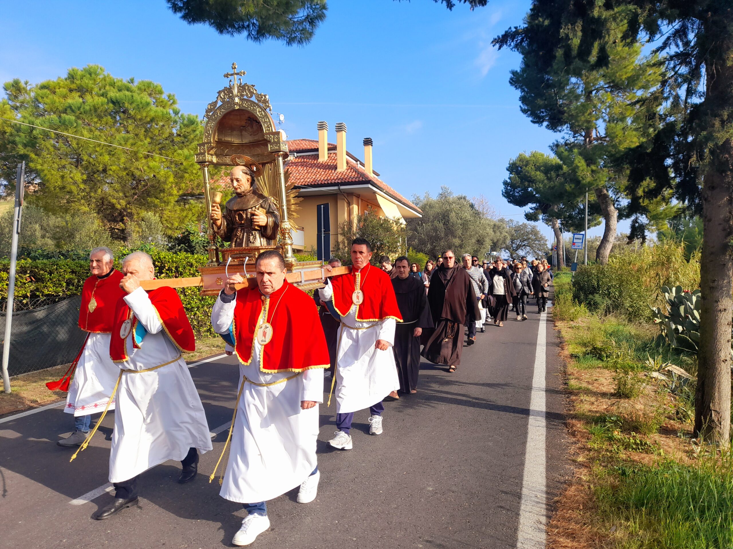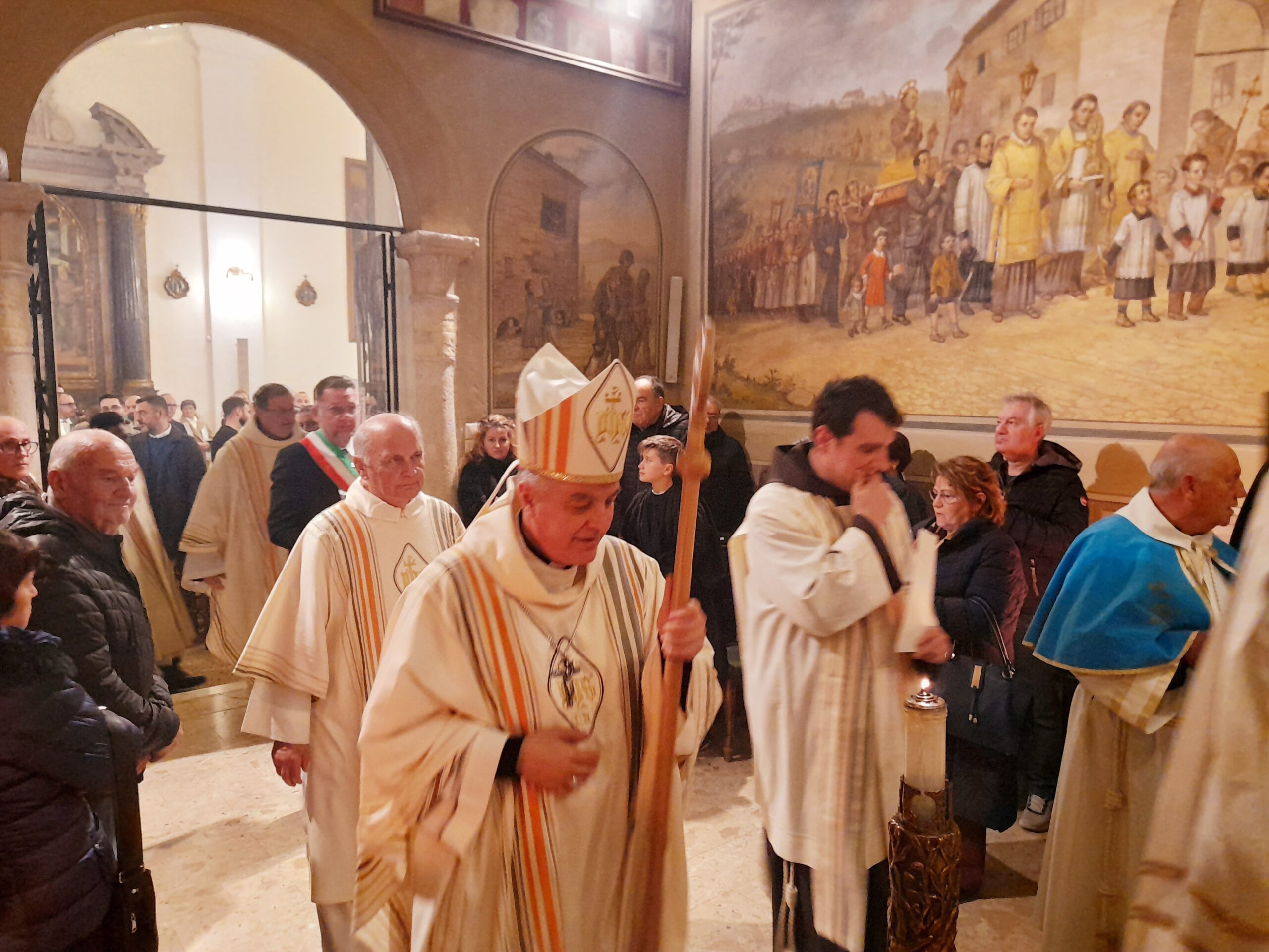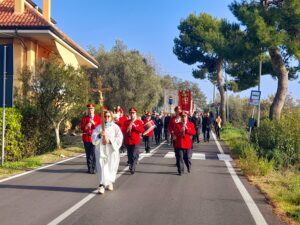 MONTEPRANDONE – Le note potenti del Corpo Bandistico “Citta di San Benedetto del Tronto”; i colori vivi dei gonfaloni delle Confraternite; la folla numerosa di autorità e fedeli; la preghiera comunitaria lungo le vie del paese; l’invito accorato di mons. Gianpiero Palmieri, vescovo delle due Diocesi del Piceno, a vivere “una fede vera, incarnata, non alienante, capace di prendersi cura“: possiamo riassumere così i festeggiamenti che si sono svolti ieri, 28 Novembre 2024, a Monteprandone, in onore di San Giacomo della Marca, Patrono non solo del Comune marchigiano, ma anche di una delle Vicarie della Diocesi di San Benedetto del Tronto – Ripatransone – Montalto, quella che comprende le parrocchie di Porto d’Ascoli, Martinsicuro, Colonnella e ovviamente Monteprandone.