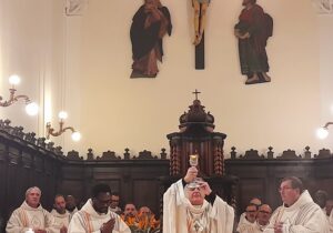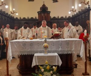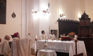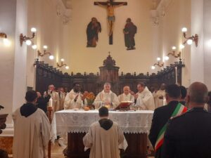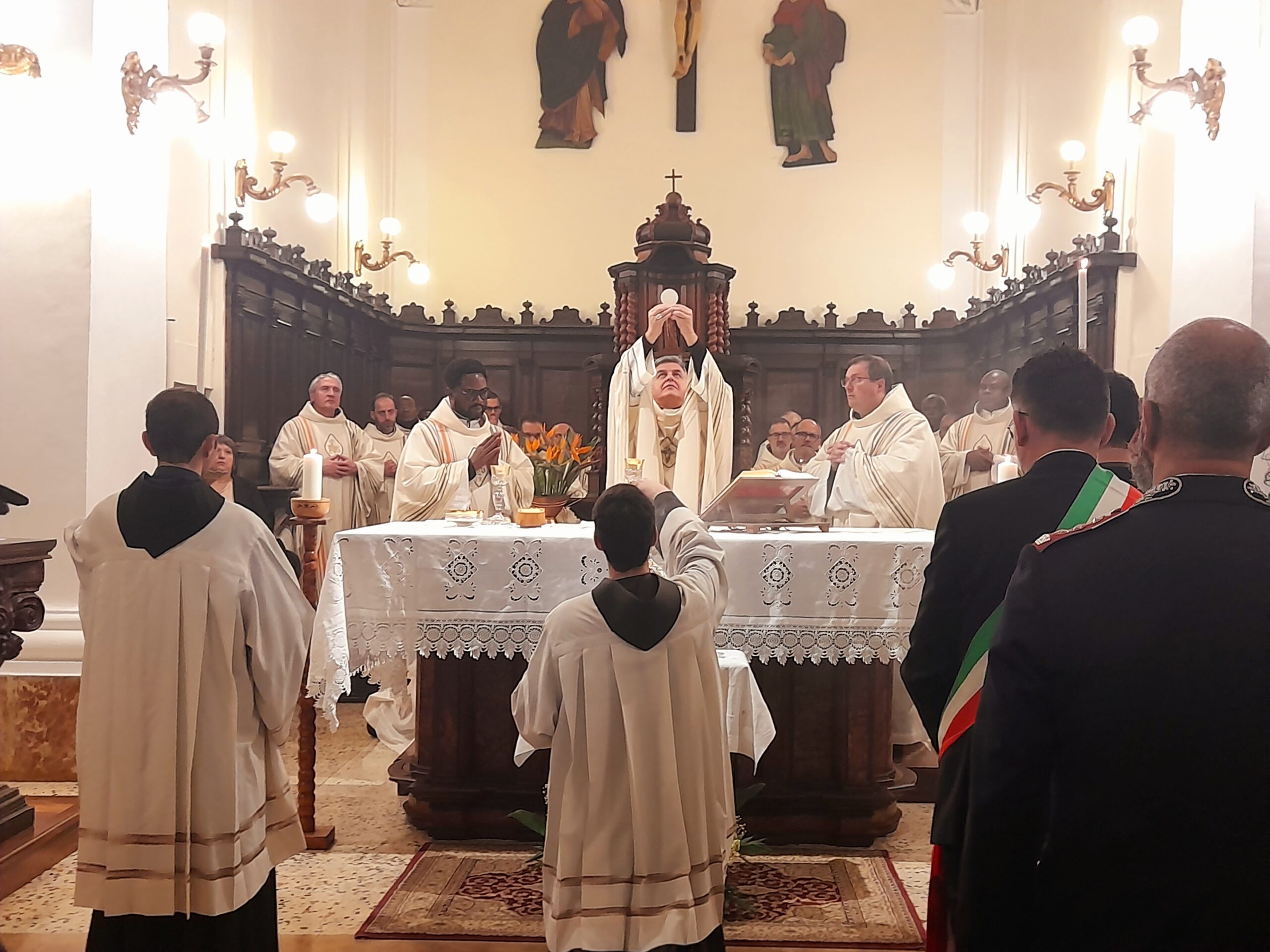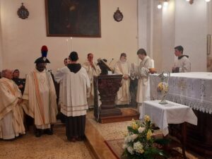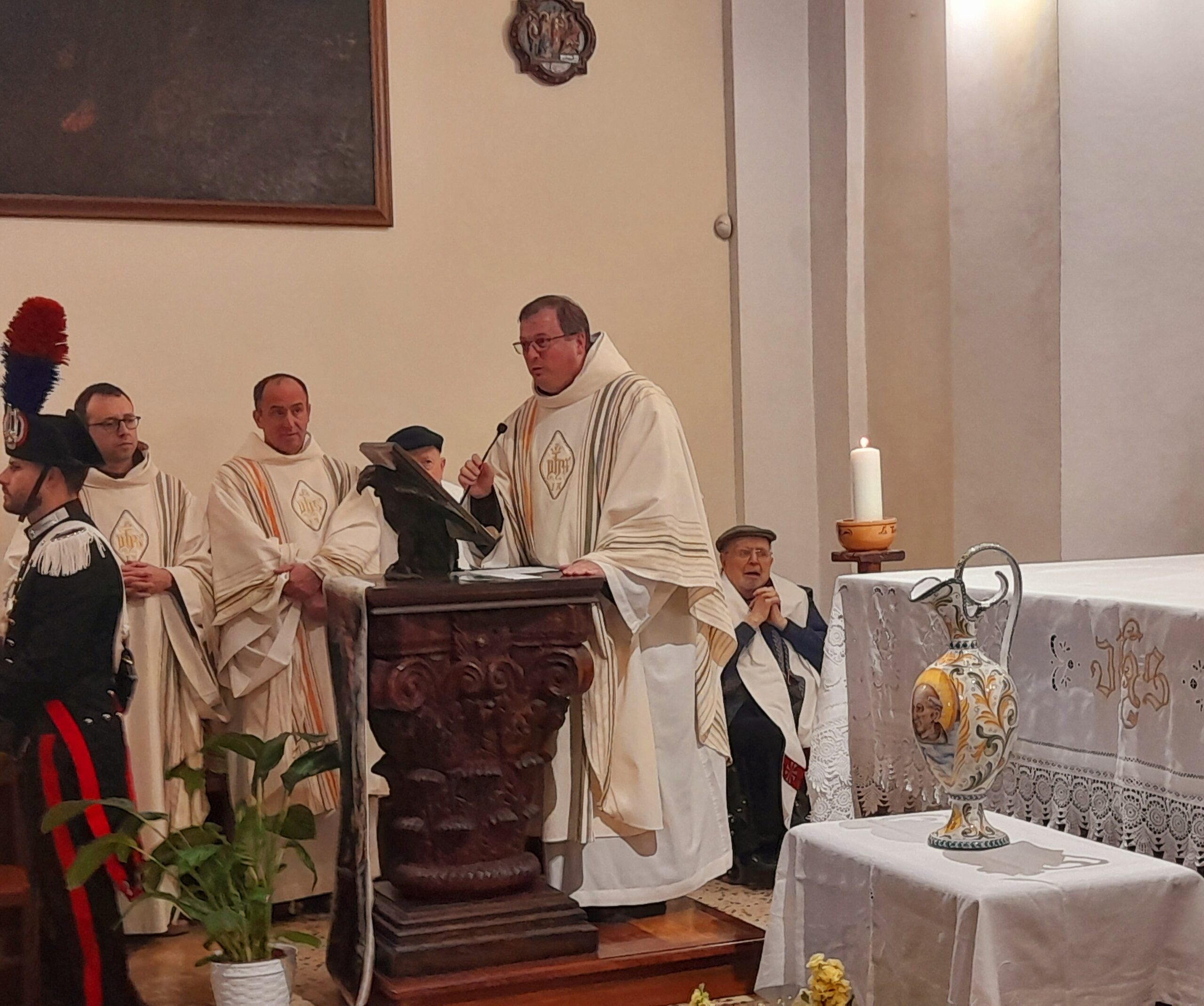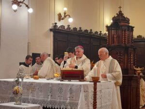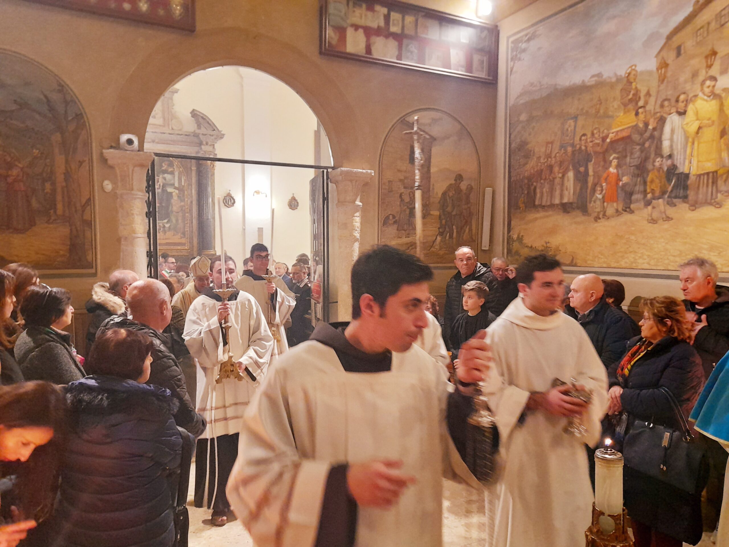 Alle ore 11:30 è iniziata la Celebrazione Eucaristica presso il Santuario di San Giacomo della Marca, al termine della quale è stato offerto l’olio per la lampada all’altare del Santo da parte del sindaco Sergio Loggi. La Santa Messa, animata dalla Corale Polifonica San Giacomo della Marca, è stata presieduta dal vescovo Gianpiero Palmieri e concelebrata da padre Simone Giampieri, provinciale dei Frati Minori delle Marche, padre Marco Buccolini, guardiano del Santuario di San Giacomo della Marca, don Vincent Ifeme, parroco della comunità San Niccolò di Monteprandone, don Armando Moriconi, parroco dell’Unità Pastorale Sacro Cuore e Regina Pacis di Centobuchi, oltre che da numerosi frati minori delle Marche e da altri sacerdoti e diaconi della Vicaria San Giacomo della Marca e da tutto il popolo di Dio riunito.