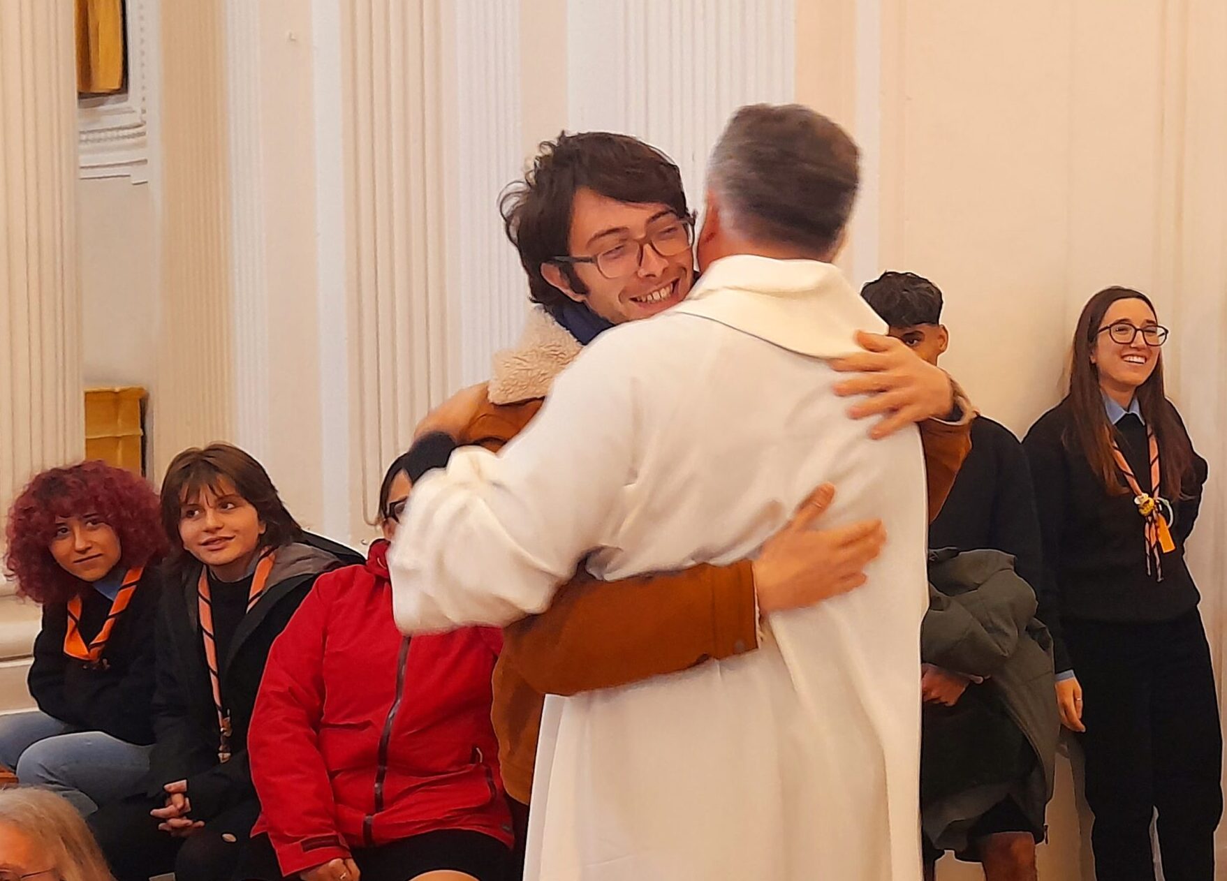 Al termine di questo secondo momento, il vescovo Gianpiero ha invitato i giovani presenti a abbracciarsi, precisando di aprire le braccia non verso un amico o un conoscente, bensì possibilmente verso un estraneo, una persona non conosciuta. Un gesto semplice, ma dal significato molto profondo: chi ha ricevuto l’abbraccio misericordioso di Dio, non può far altro che far sentire il calore di quell’abbraccio anche agli altri, divenendo così missionario della gioia.