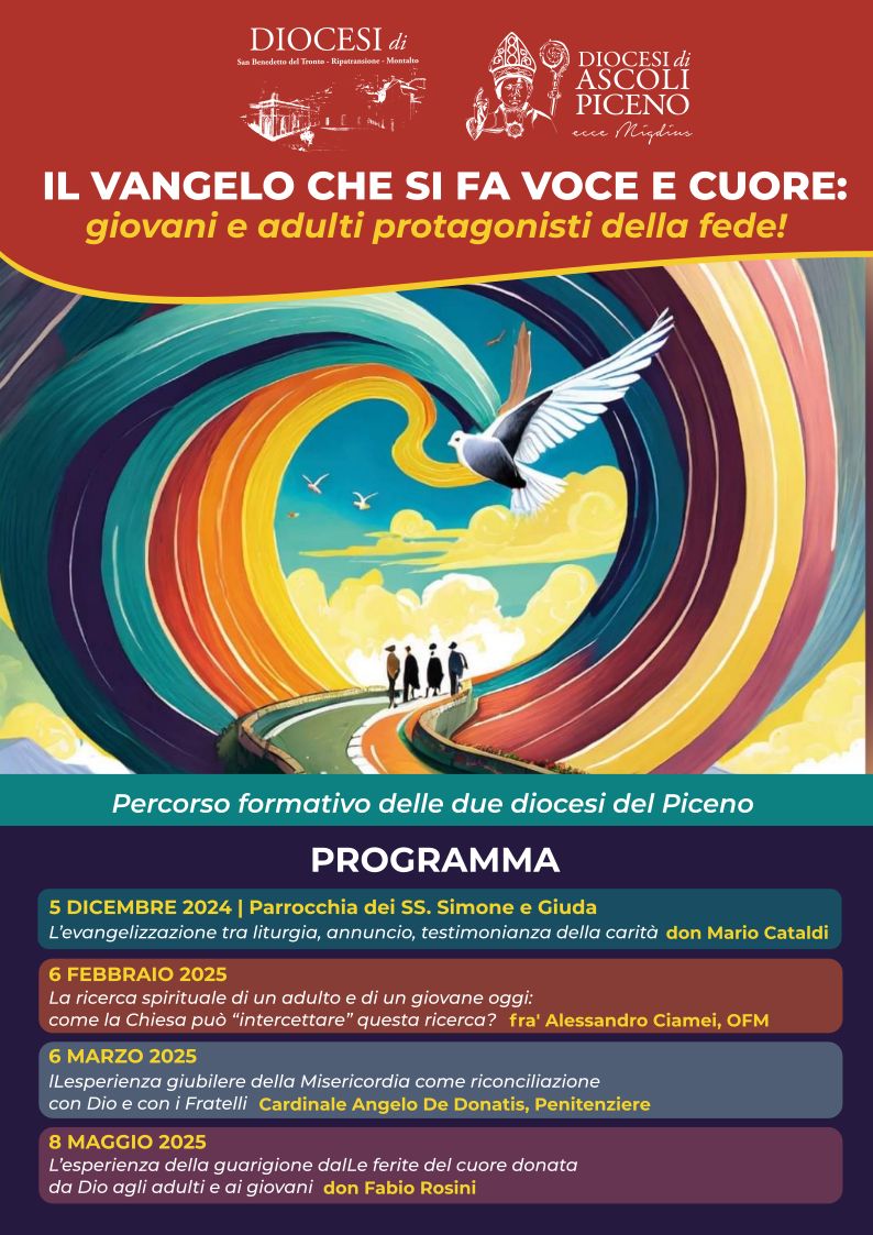 DIOCESI – La Diocesi di Ascoli Piceno insieme alla Diocesi di San Benedetto del Tronto – Ripatransone – Montalto, annunciano l’inizio di un nuovo itinerario formativo, rivolto a giovani, adulti e a tutti coloro che sono impegnati nella vita pastorale e comunitaria.