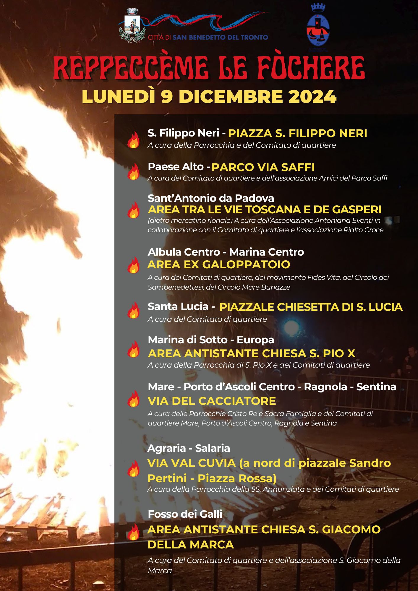 SAN BENEDETTO DEL TRONTO – Lunedì 9 dicembre torna, come da tradizione, “Reppeccème le fòchere”, l’iniziativa curata da parrocchie, comitati e associazioni di quartiere con il sostegno dell’Amministrazione comunale e del Circolo dei Sambenedettesi che vede, a partire dalle 21, l’accensione di falò in vari punti della città.