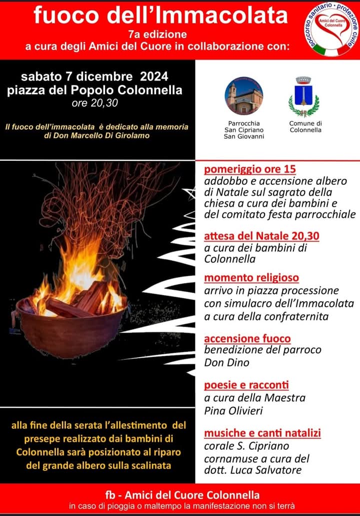 COLONNELLA – La settima edizione del “Fuoco dell’Immacolata” si terrà sabato 7 dicembre 2024 in piazza del Popolo a Colonnella, un evento organizzato dagli Amici del Cuore in collaborazione con la Parrocchia di San Cipriano e San Giovanni e il Comune di Colonnella. La manifestazione, dedicata alla memoria di Don Marcello Di Girolamo, si preannuncia come un’occasione di condivisione e spiritualità in vista del Natale.
