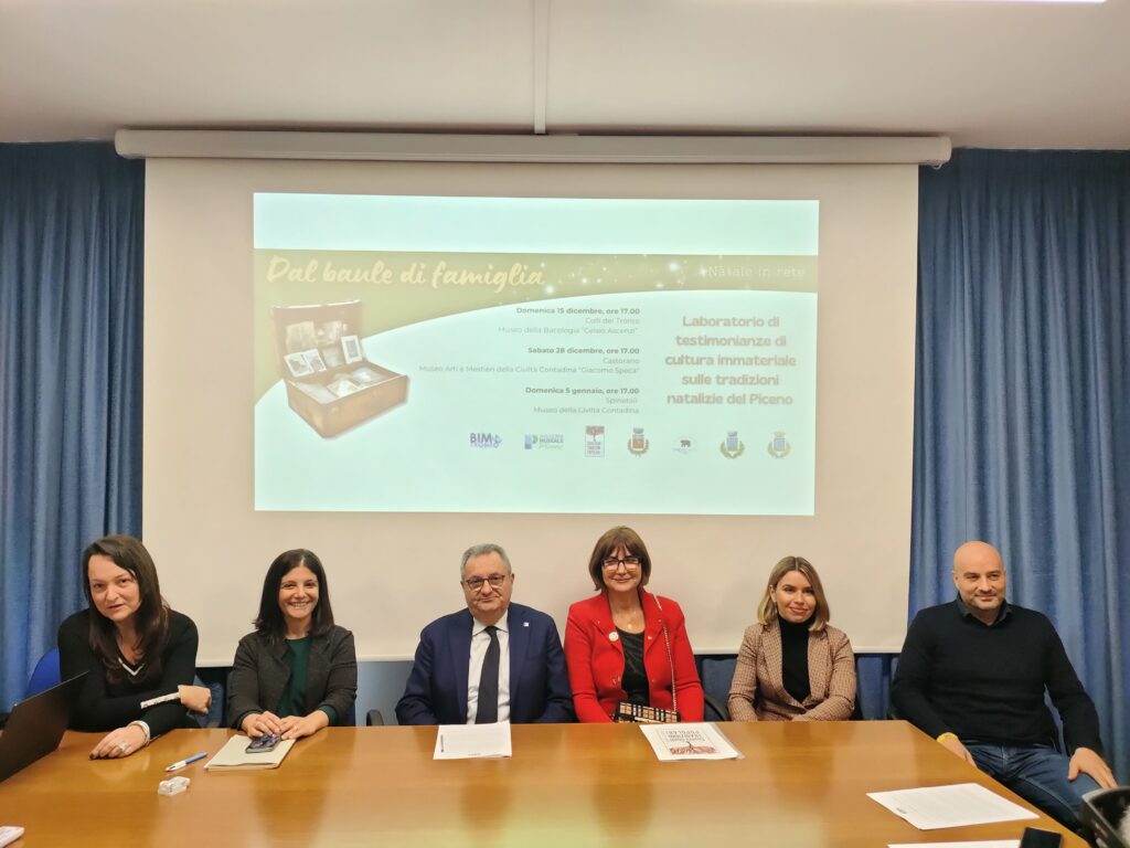 PROVINCIA – Il Bim Tronto e il Sistema Museale Piceno, in collaborazione con il Centro Studi Tradizioni Popolari hanno presentato questa mattina l’iniziativa “Dal baule di famiglia, un laboratorio di testimonianze di cultura immateriale sulle tradizioni natalizie del Piceno”. Un ciclo di tre incontri che si svolgerà nei comuni di Castorano, Colli del Tronto e Spinetoli e che porterà alla scoperta delle usanze che hanno caratterizzato il Natale nel Piceno. Grazie alla guida esperta della professoressa Gabriella Piccioni, i partecipanti saranno coinvolti in un percorso di condivisione e riflessione, dove ognuno potrà portare il proprio contributo. Gli appuntamenti si svolgeranno all’interno di alcuni musei demoetnoantropologici del Sistema Museale Piceno, veri e propri scrigni che custodiscono la storia e la cultura del territorio. Qui, tra utensili e antichi strumenti, i partecipanti potranno approfondire la funzione d’uso e il significato di oggetti che appartengono alla quotidianità di un tempo e scoprire come alcune tradizioni si sono evolute negli anni arrivando fino a noi.