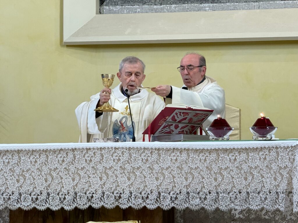 La celebrazione è iniziata con un canto mariano, che ha subito creato un’atmosfera di intensa spiritualità. Padre Leopoldo ci ha poi commossi con il suo personale ringraziamento al Signore e con la sua umile richiesta di perdono. A seguire, noi partecipanti abbiamo risposto con biglietti di lode e ringraziamento sia al Signore sia a Padre Leopoldo, esprimendo la nostra riconoscenza per la sua guida e la sua amicizia. Molti doni sono stati offerti, e non è mancato un momento di festa per celebrare il suo compleanno.