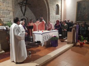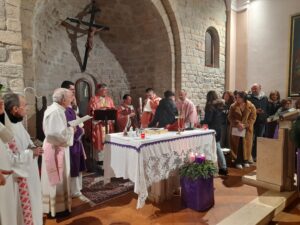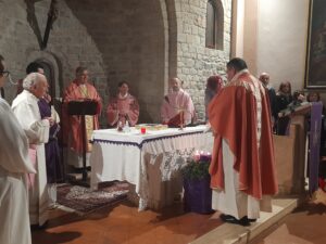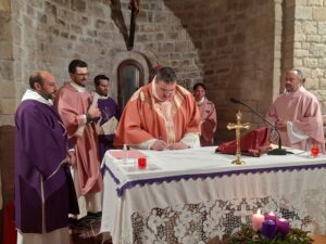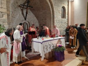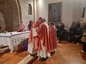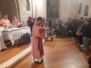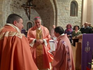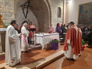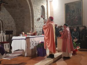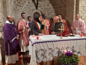 Poi il nuovo parroco, attraversando la navata della chiesa, ha asperso i fedeli presenti in assemblea ed infine ha venerato l’altare con l’incensazione e il bacio, segno dell’amore che lega la Chiesa a Dio. Come spiegato infatti dal vescovo Gianpiero, nella liturgia della Chiesa, l’altare è il talamo nuziale in cui lo sposo, il Signore, dà il corpo e il sangue per la sua sposa, ovvero la Chiesa. Il gesto del bacio, dunque, sottolinea il mistero nuziale che si realizza sull’altare.