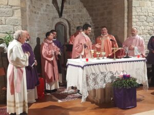Dopo l’omelia, la Celebrazione Eucaristica è proseguita come di consueto, anche se con una piccola variazione: il Credo, che normalmente viene detto dall’intera assemblea, in questo caso è stato professato da don Rodolfo e dal diacono Luca. Il vescovo Palmieri, infatti, ha invitato il nuovo parroco ed il nuovo diacono a portarsi davanti all’altare per rinnovare la loro professione di fede.