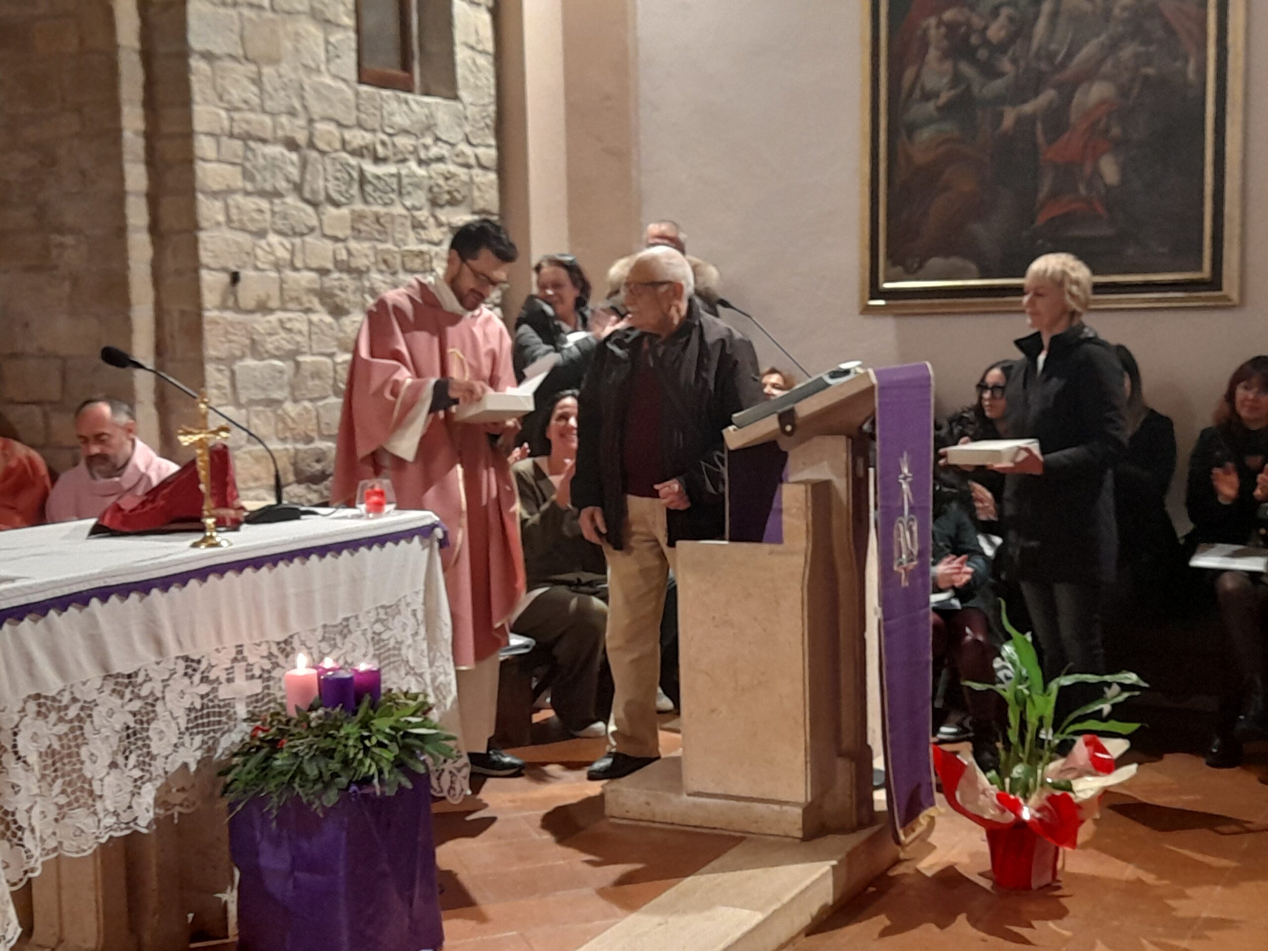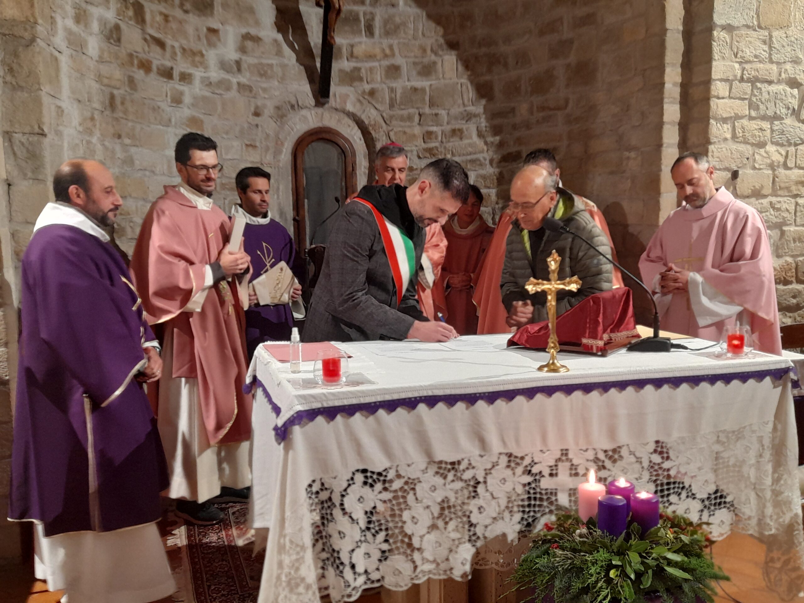 «A don Francesco, che ci ha accolto, aiutato e sostenuto, grazie di tutto. A don Rodolfo e al diacono Luca, la casa costruita sulla roccia è una chiesa e quella roccia è un ponte naturale, la nostra identità. Benvenuti! ».