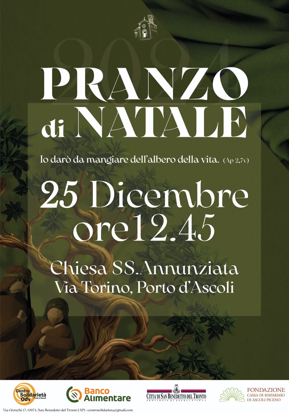 Il 25 dicembre, alle ore 12:45, presso la Chiesa SS. Annunziata di Via Torino a Porto d’Ascoli, si terrà il “Pranzo di Natale”, un evento che incarna i valori autentici di condivisione e solidarietà. L’iniziativa di quest’anno si ispira al versetto dell’Apocalisse “Io darò da mangiare dell’albero della vita” (Ap 2,7), si propone, di anno in anno, come un momento di comunione e di vicinanza per coloro che si trovano in difficoltà o desiderano vivere questa giornata speciale in compagnia.