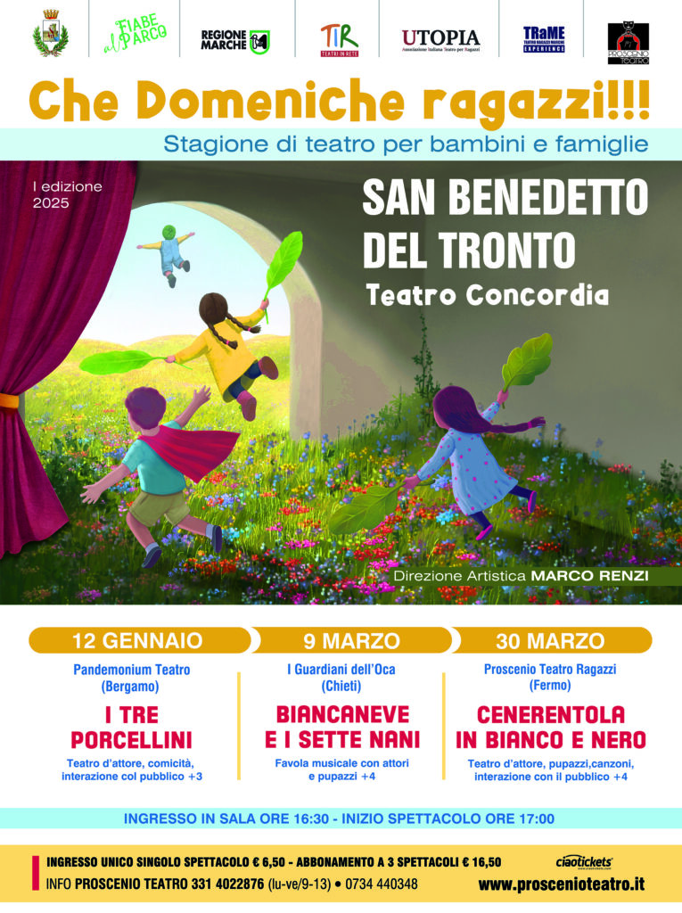SAN BENEDETTO DEL TRONTO – Il teatro “Concordia” ospiterà tra gennaio e marzo 2025 tre spettacoli di teatro per ragazzi inseriti nella rassegna “CHE DOMENICHE RAGAZZI!!!” promossa da “Proscenio Teatro”, per la direzione artistica di Marco Renzi, come parte del più ampio TIR- TEATRI IN RETE, che coinvolge e mette in rete otto Comuni nelle Province di Macerata, Fermo e Ascoli Piceno.
