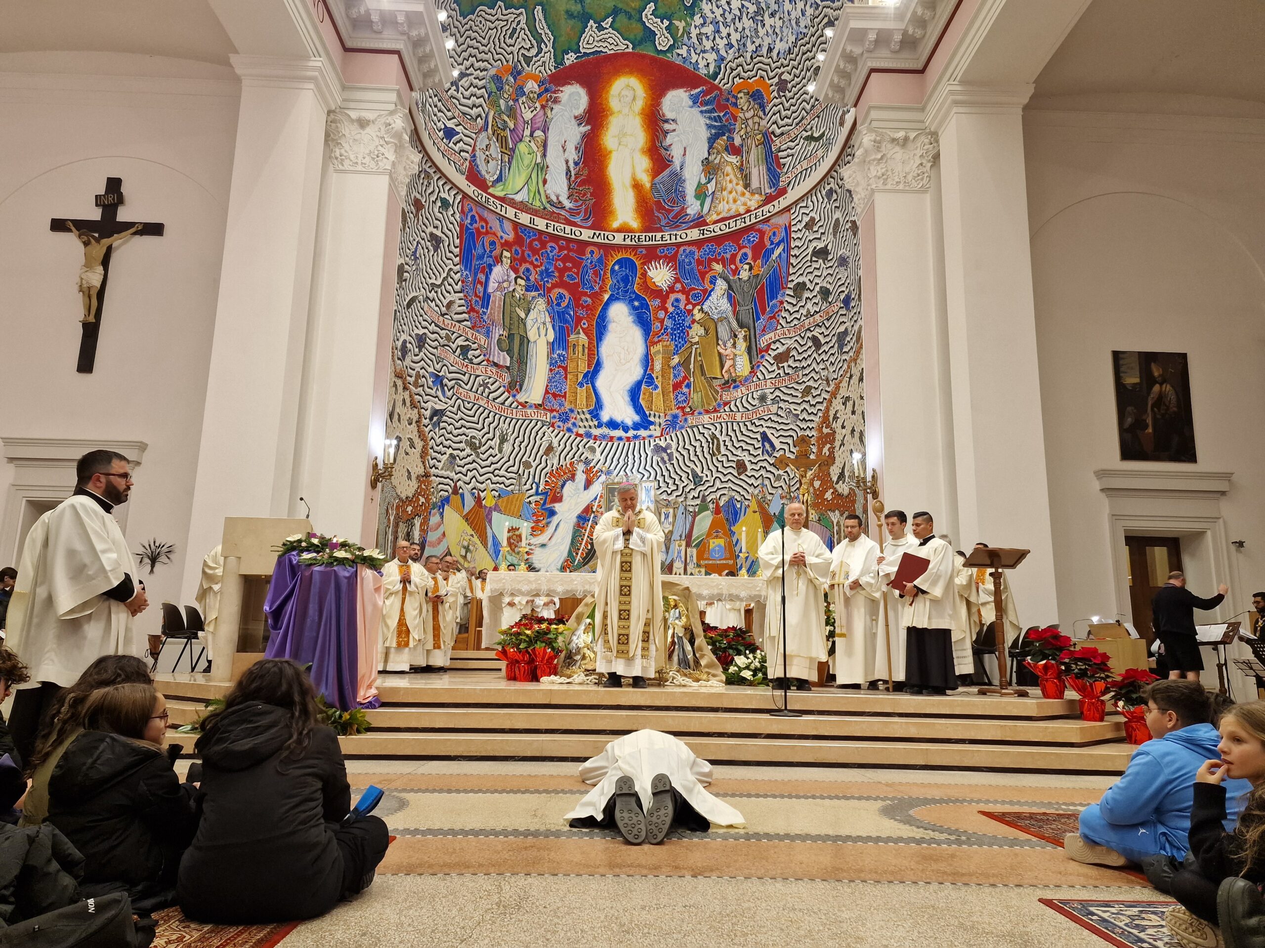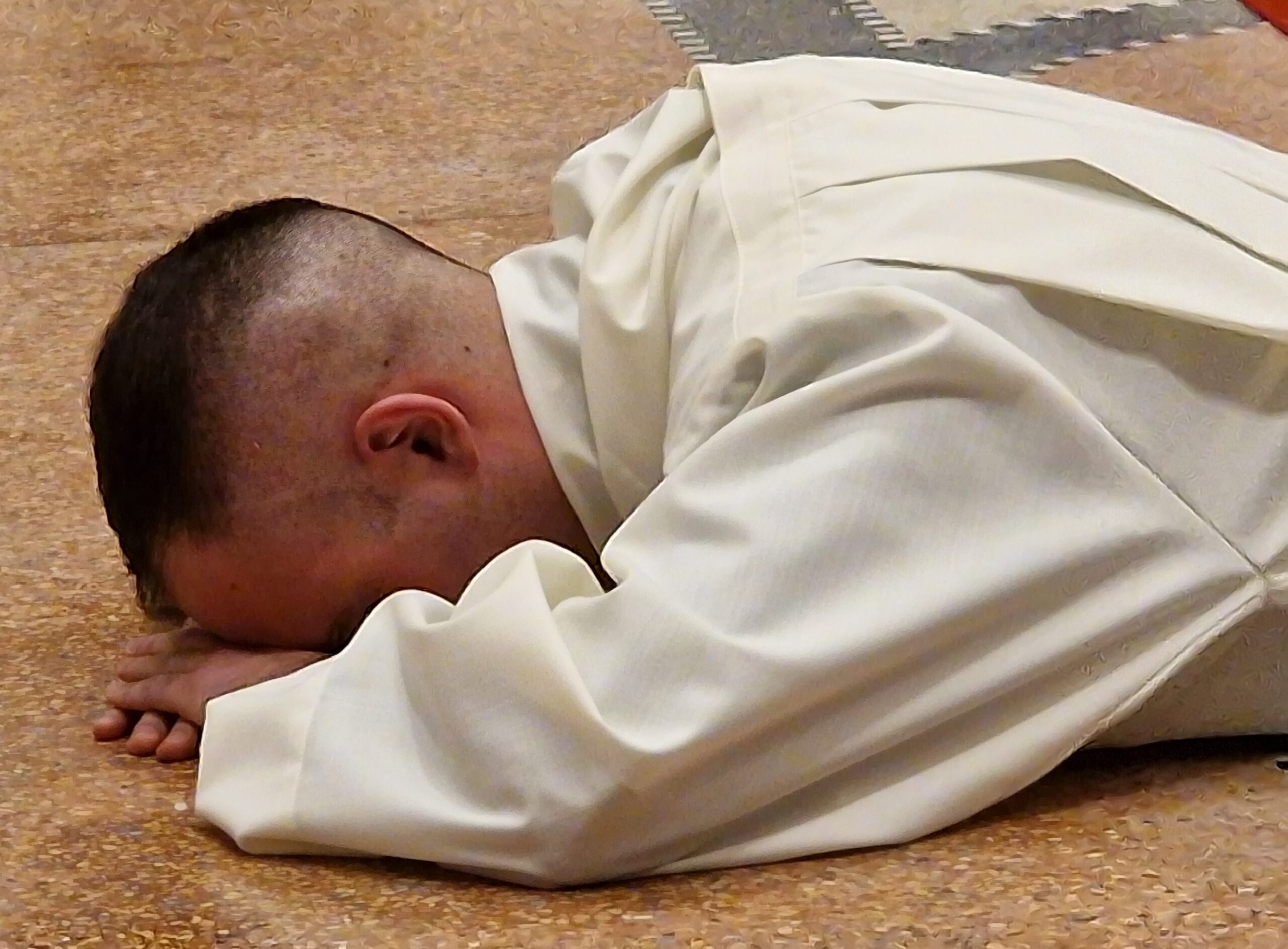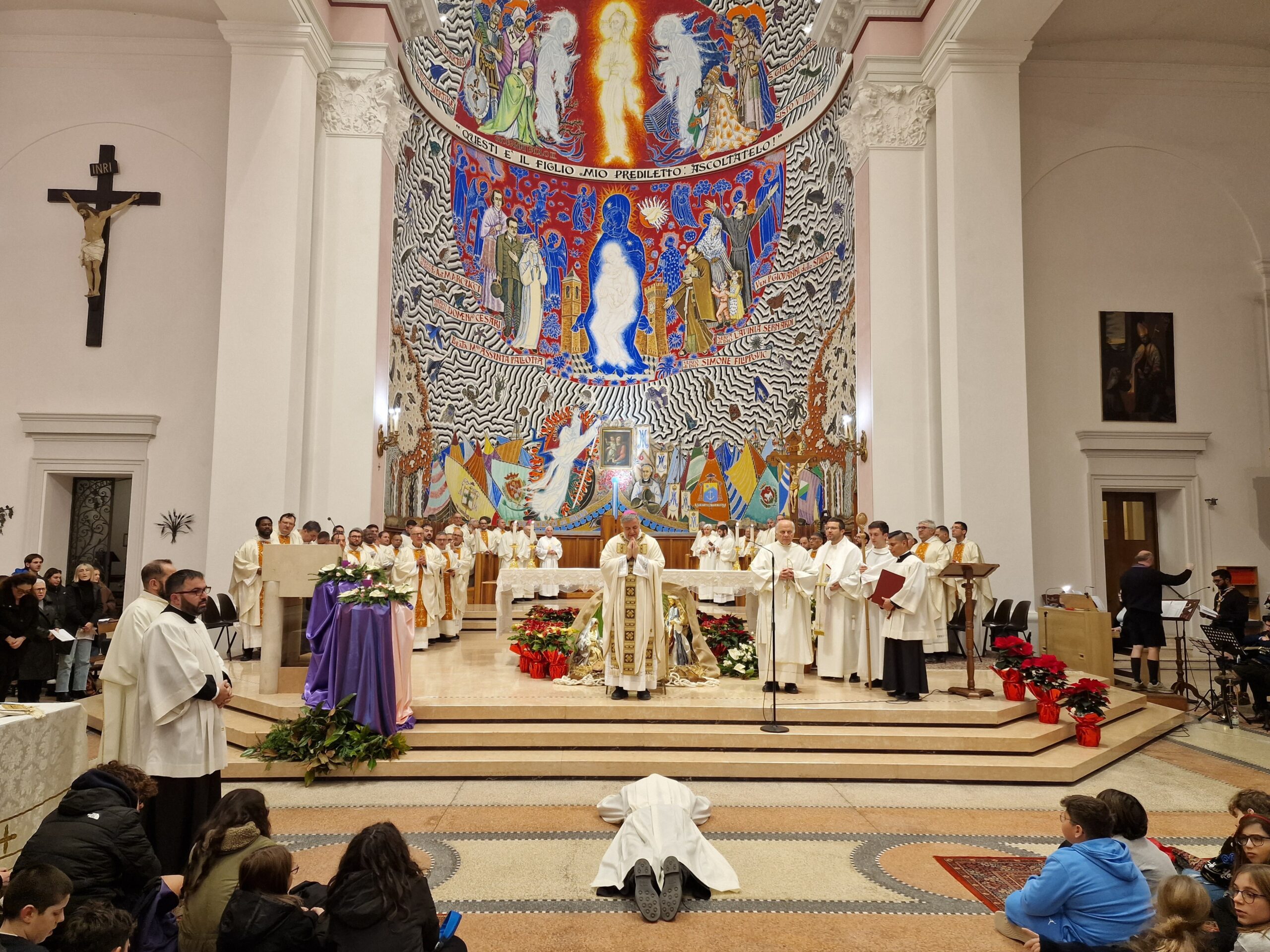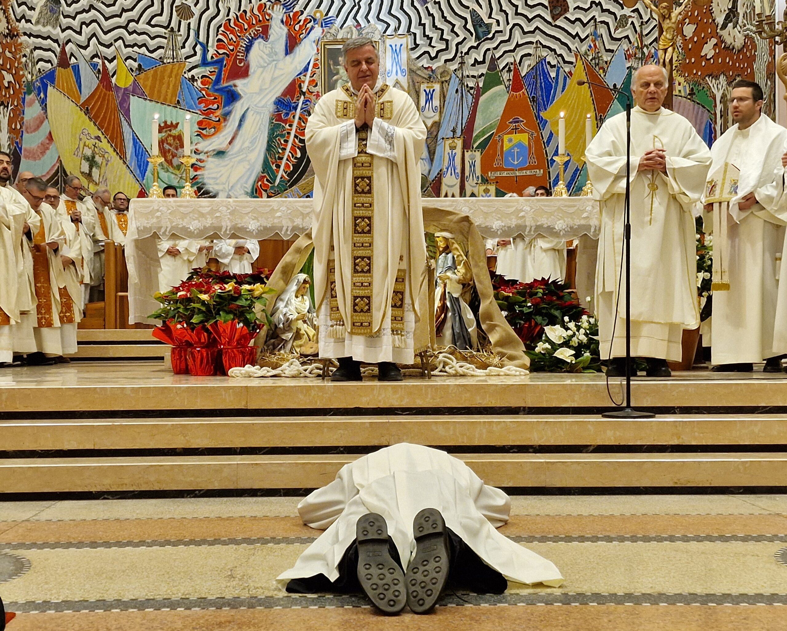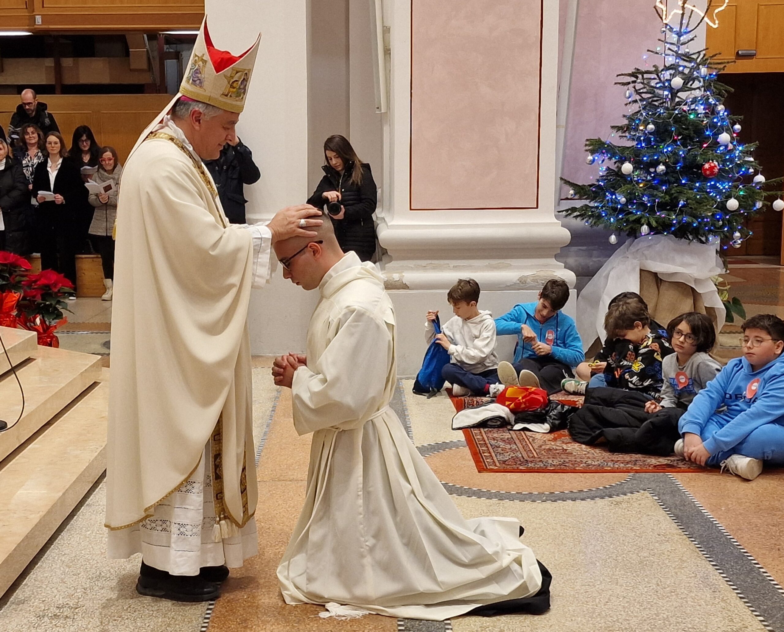 Dopo aver preso gli impegni solenni, il seminarista, come previsto dal rito, si è sdraiato a terra e, insieme all’assemblea riunita, ha pregato le Litanie dei Santi, invocandoli per concedere a lui la benedizione. A seguire Bollettini si è inginocchiato davanti al vescovo Palmieri, il quale ha imposto le mani sul capo del giovane e ha supplicato il Signore di effondere in lui lo Spirito Santo, affinché lo fortifichi con i sette doni della Sua Grazia, così da compiere fedelmente l’opera del Ministero.