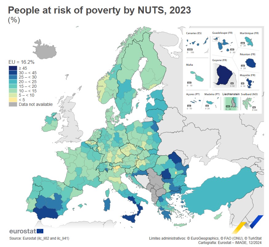 “Il 16,2% della popolazione dell’Unione europea, ovvero circa 71,7 milioni di persone”, nel 2023 “era a rischio povertà”. Il dato emerge da un’indagine diffusa da Eurostat. “Il tasso di rischio di povertà si basa sulle soglie di povertà nazionali e la mappa presenta il rischio di povertà a livello regionale”, specifica l’istituto di statistica della Commissione europea. Dunque i dati sono relativi agli standard di vita nazionali eppure non mancano alcuni elementi di valutazione. Ad esempio si evince che “a livello regionale, 10 regioni dell’Ue avevano una quota di persone a rischio di povertà superiore al 30%”. Le quote più elevate sono state riscontrate nella regione più esterna della Francia, la Guyana, dove più della metà (53,0%) delle persone era a rischio di povertà, seguita dalla Calabria (40,6%) e dalla Sicilia (38,0%) in Italia. Al contrario, 26 regioni hanno registrato quote inferiori al 10%. La regione rumena di Bucureşti-Ilfov aveva i tassi più bassi di persone a rischio di povertà (2,1%), davanti alla regione italiana Provincia Autonoma di Bolzano/Bozen (3,1%) e alla regione belga Provincia Oost-Vlaanderen (5,4%).