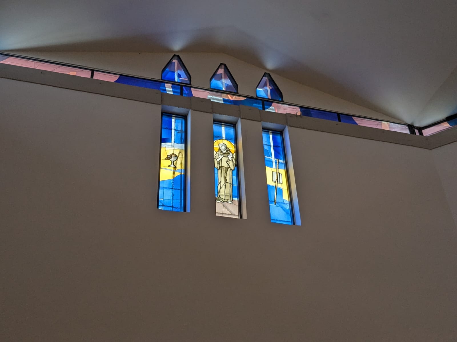 Se da un lato il colore azzurro richiama l’acqua e il cielo invitando alla purificazione, dall’altro il progressivo avvicinamento all’altare porta i colori ad assumere la scala del rosso, simboleggiano la passione e resurrezione di Cristo in un itinerario teologico che accompagna il fedele nella sua crescita spirituale. Immancabile, poi, il richiamo a San Giacomo della Marca nelle monofore.