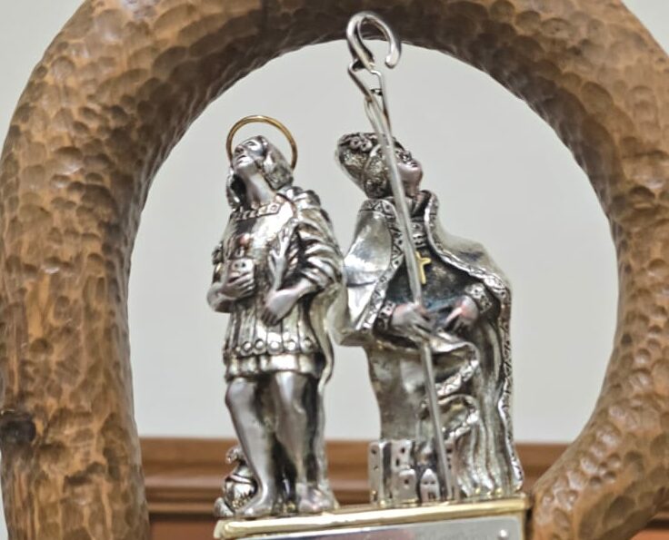 Alla sommità del pastorale sono rappresentati i Santi patroni delle due comunità diocesane: Sant’Emidio, patrono di Ascoli Piceno, e San Benedetto Martire, Patrono di San Benedetto del Tronto.