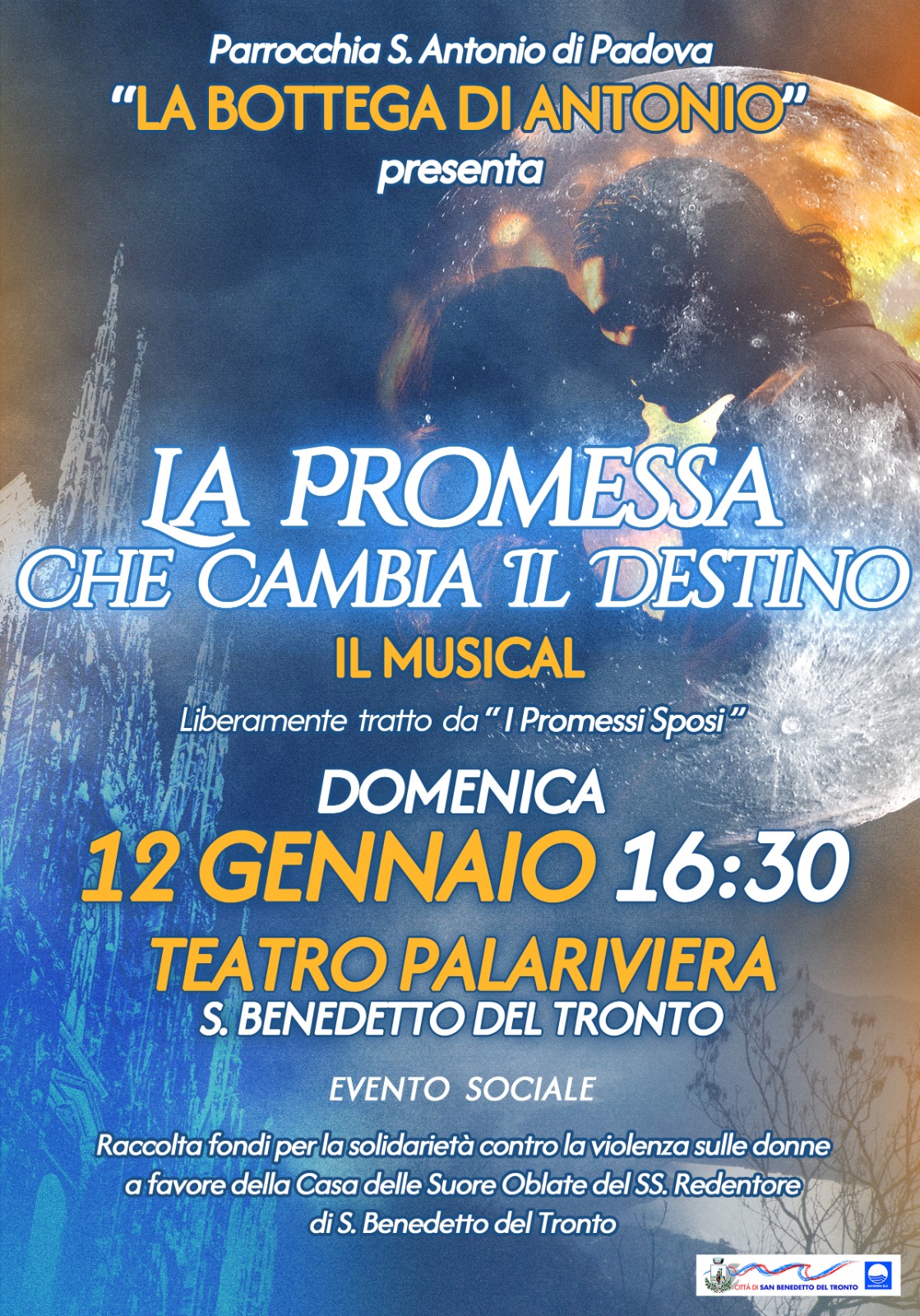 SAN BENEDETTO DEL TRONTO – Il gruppo teatrale La Bottega di Antonio, formato da giovani e animatori della Parrocchia di Sant’Antonio di Padova a San Benedetto del Tronto, è lieto di annunciare la replica del musical “La Promessa che cambia il destino”, ispirato al celebre romanzo I Promessi Sposi di Alessandro Manzoni.