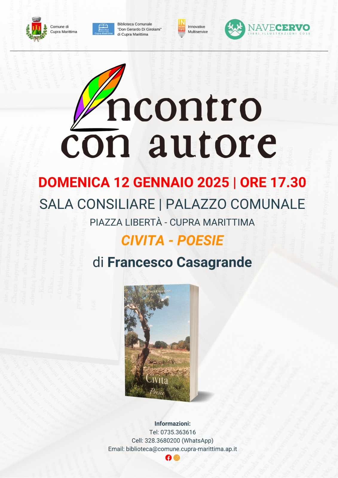 CUPRA MARITTIMA – Domenica 12 Gennaio alle ore 17.30, presso la Sala Consiliare del Comune di Cupra Marittima, si terrà la presentazione del volume “CIVITA – Poesie”, di Francesco Casagrande.
