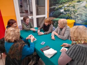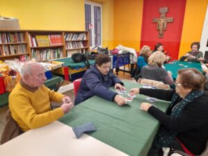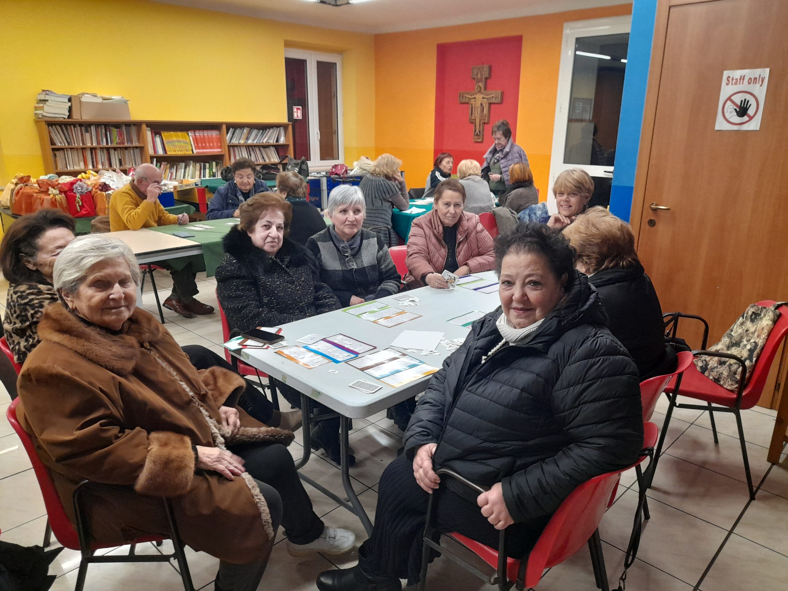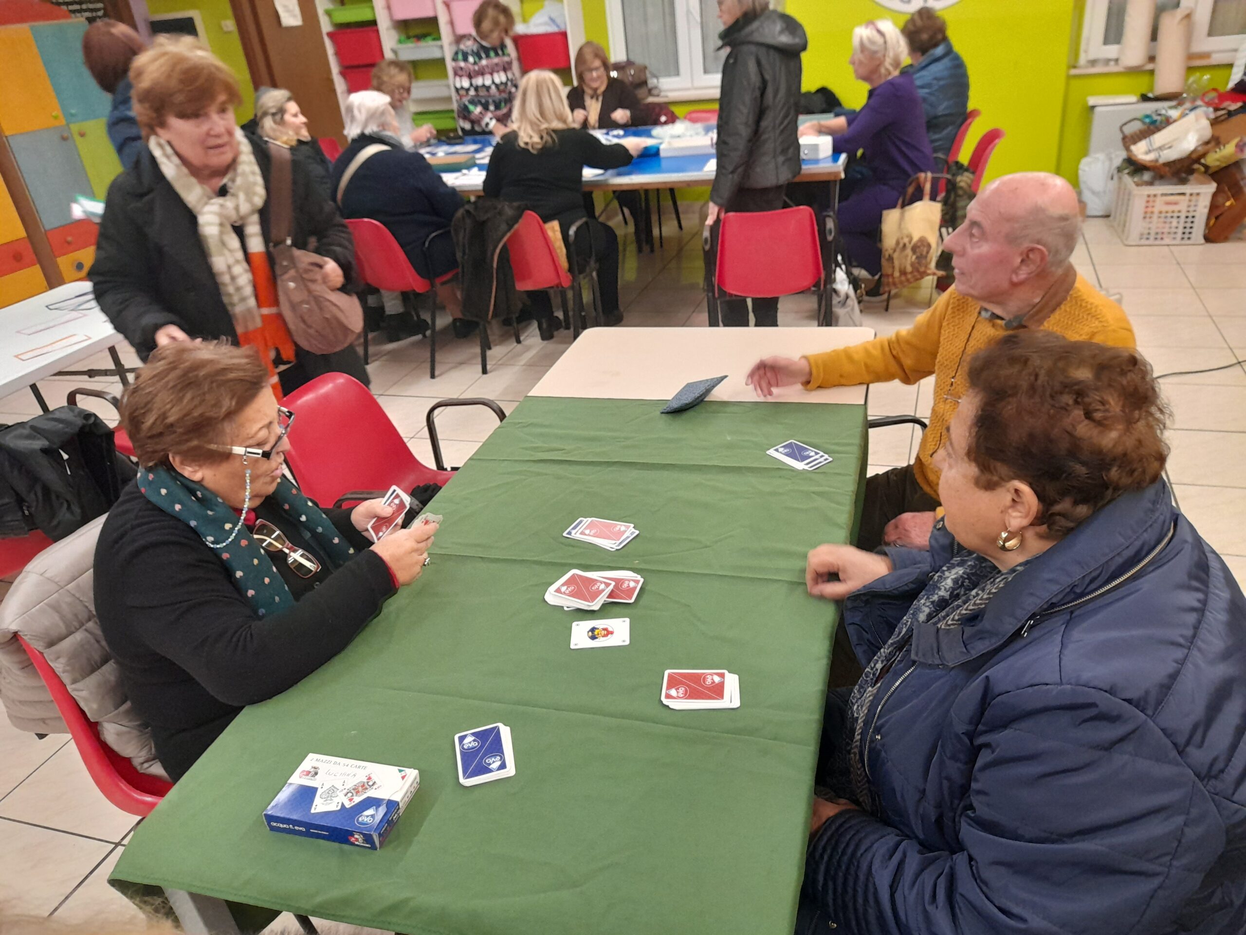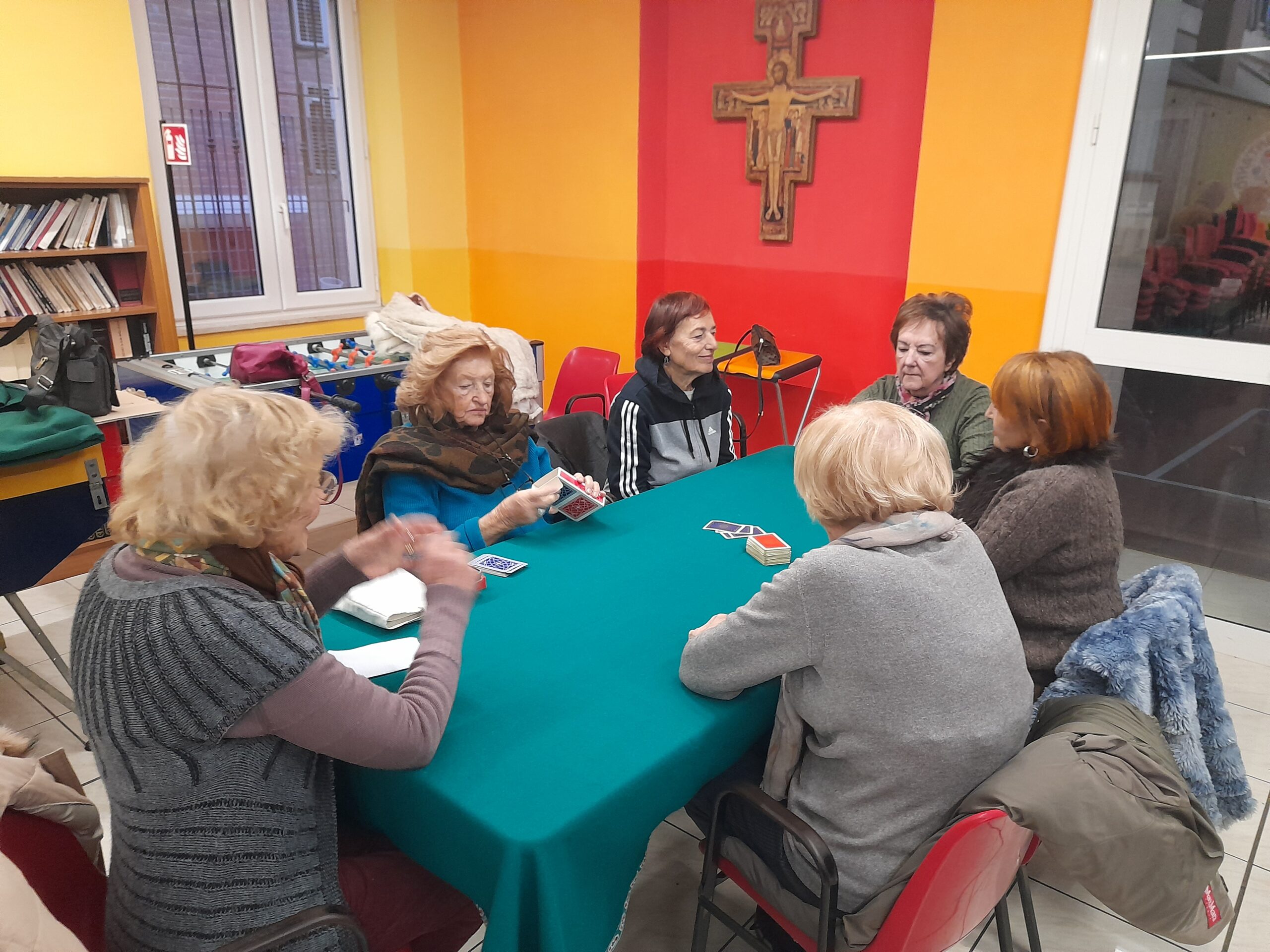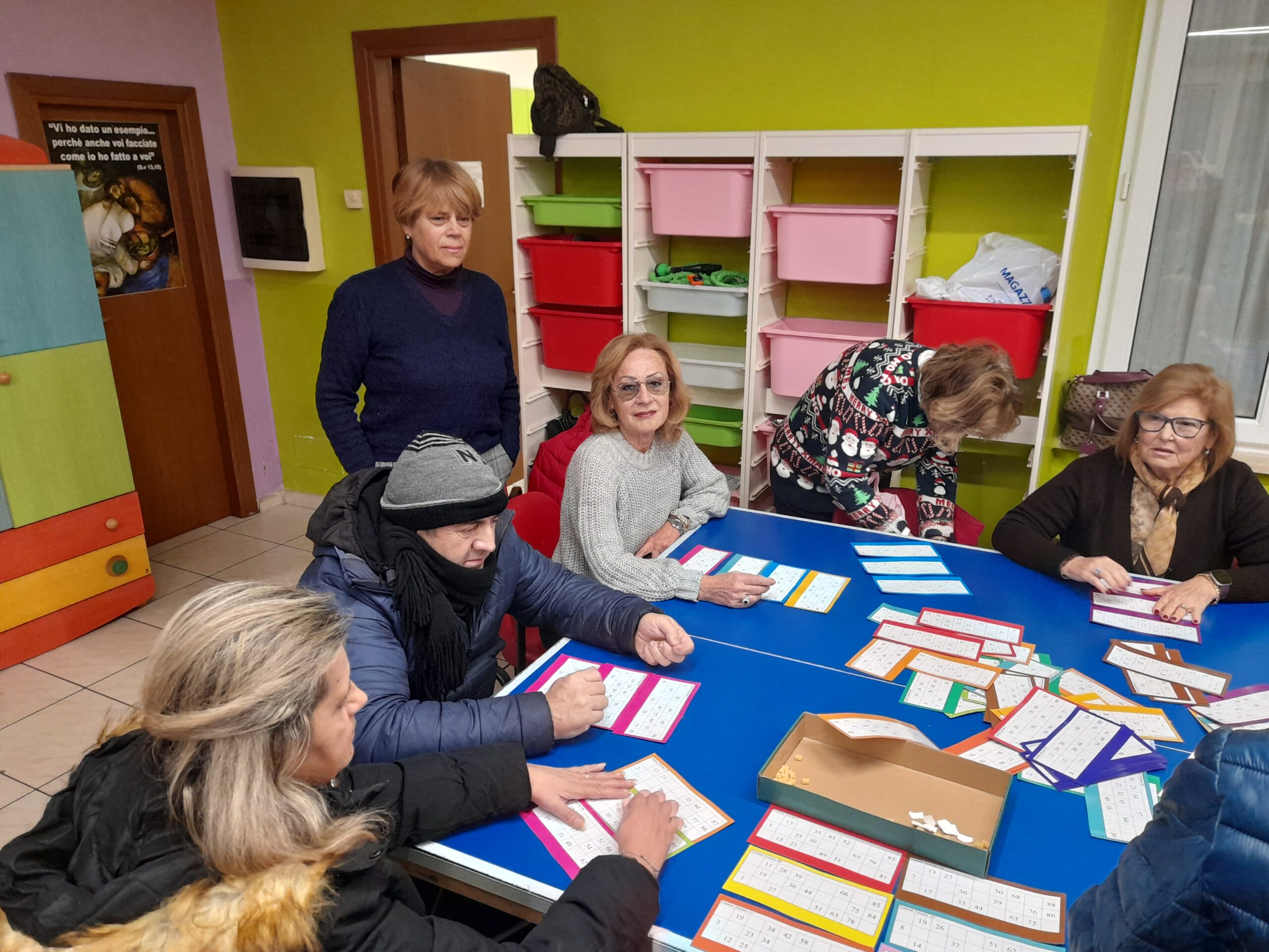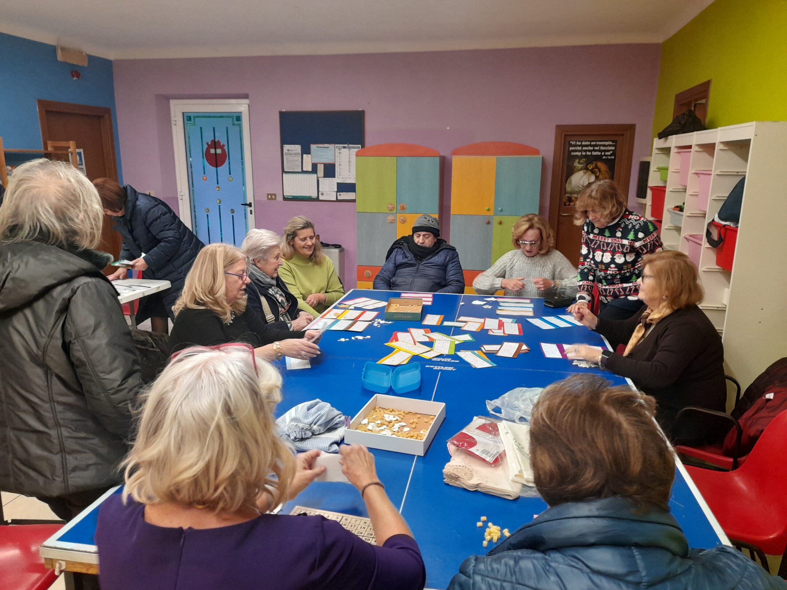 Racconta Maria Adele Ricci, una delle fondatrici: «Io sono biologa e all’epoca lavoravo come impiegata nel direttivo del Comune in ambito sociale. La mia amica Luigia Cameli, invece, era professoressa di lingua inglese ed insegnava qui a San Benedetto. Insieme, inoltre, donavamo qualche ora del nostro tempo alla Caritas parrocchiale. Perciò entrambe avevamo a che fare, per motivi di lavoro e anche nel tempo libero, con una bella fetta di persone della nostra comunità e, seppur in contesti diversi, ci siamo rese conto che il nostro quartiere era altamente popolato da professionisti ed impiegati spesso fuori per tutto il giorno e che quindi molti anziani vivevano situazioni di solitudine. Allora abbiamo pensato di regalare a queste persone anziane e sole alcuni momenti di svago per fare loro compagnia. Ci teniamo a precisare, però, che, sebbene l’idea sia stata nostra, abbiamo subito coinvolto altre persone, come Rosa, Alba, Antonella, Anna, Angela, Gina, Giancarlo e Giuseppe, da tutti noi chiamato Peppone. Abbiamo chiesto al parroco un locale, che ci è stato subito assegnato. Da allora fino ad oggi, ogni mercoledì pomeriggio, per tutto l’anno, ci riuniamo nei locali dell’oratorio per stare insieme e fare qualcosa che ci diverte».