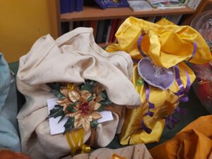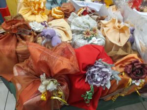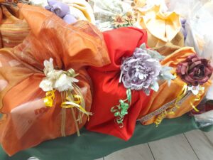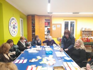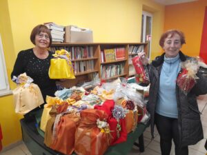 «Come ha accennato Maria Adele – spiega Luigia Cameli, l’altra fondatrice del gruppo –, l’intento è di trascorrere del tempo insieme sia per parlare, socializzare e divertirci, sia per fare dei lavoretti artigianali con cui realizziamo oggetti destinati alla vendita, così da aiutare, con il ricavato, la nostra Caritas parrocchiale. Le attività in cui ci cimentiamo sono diverse: qualcuna di noi è brava a ricamare, qualche altra sa fa all’uncinetto, altre lavorano a maglia, altre fanno specifici lavori artigianali per realizzare sacchetti e confezioni regalo con stoffe che ci vengono donate. Molti parrocchiani, infatti, sono in possesso di stoffe tessute a mano dalle nostre nonne nel dopoguerra, ce ne regalano rotoli interi che noi tagliamo e ricamiamo per farci grembiuli, strofinacci, tovagliette, qualsiasi oggetto ci venga in mente che possa essere utile alle famiglie».