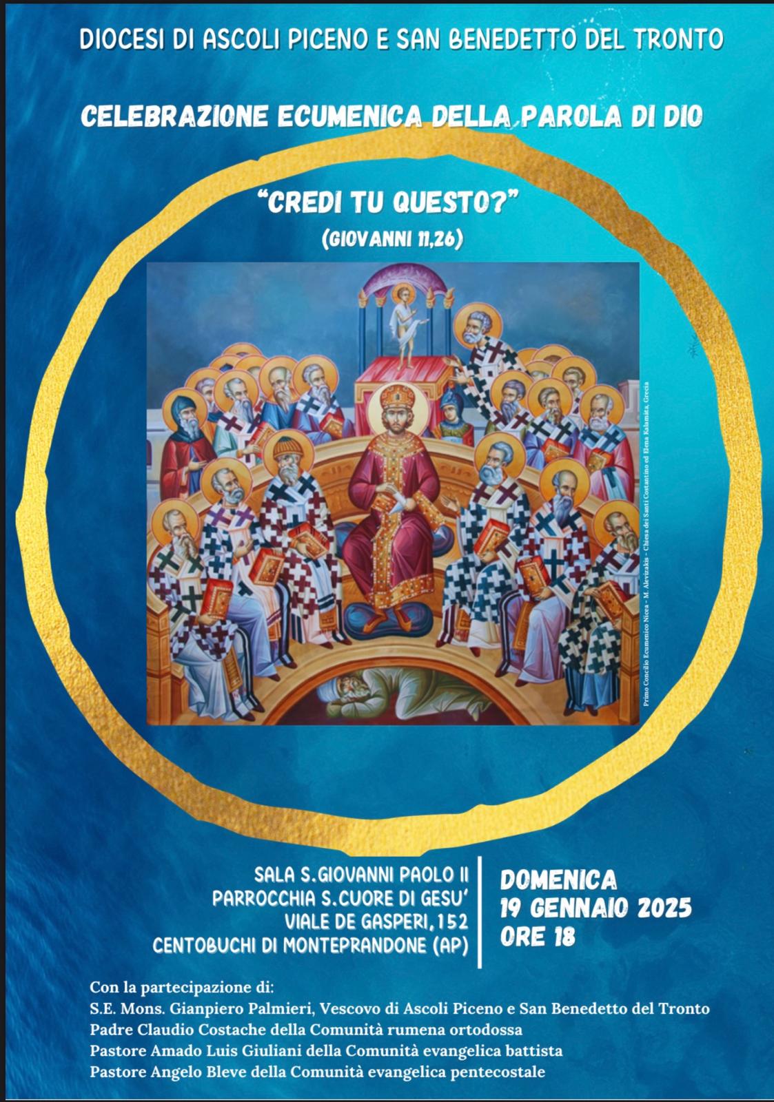 MONTEPRANDONE – Domenica 19 gennaio, alle ore 18, nella Sala San Giovanni Paolo II della Parrocchia Sacro Cuore di Gesù a Centobuchi di Monteprandone (AP), si terrà una Celebrazione Ecumenica della Parola di Dio, organizzata dalla Diocesi di Ascoli Piceno e dalla Dicoesi di San Benedetto del Tronto – Ripatransone – Montalto.