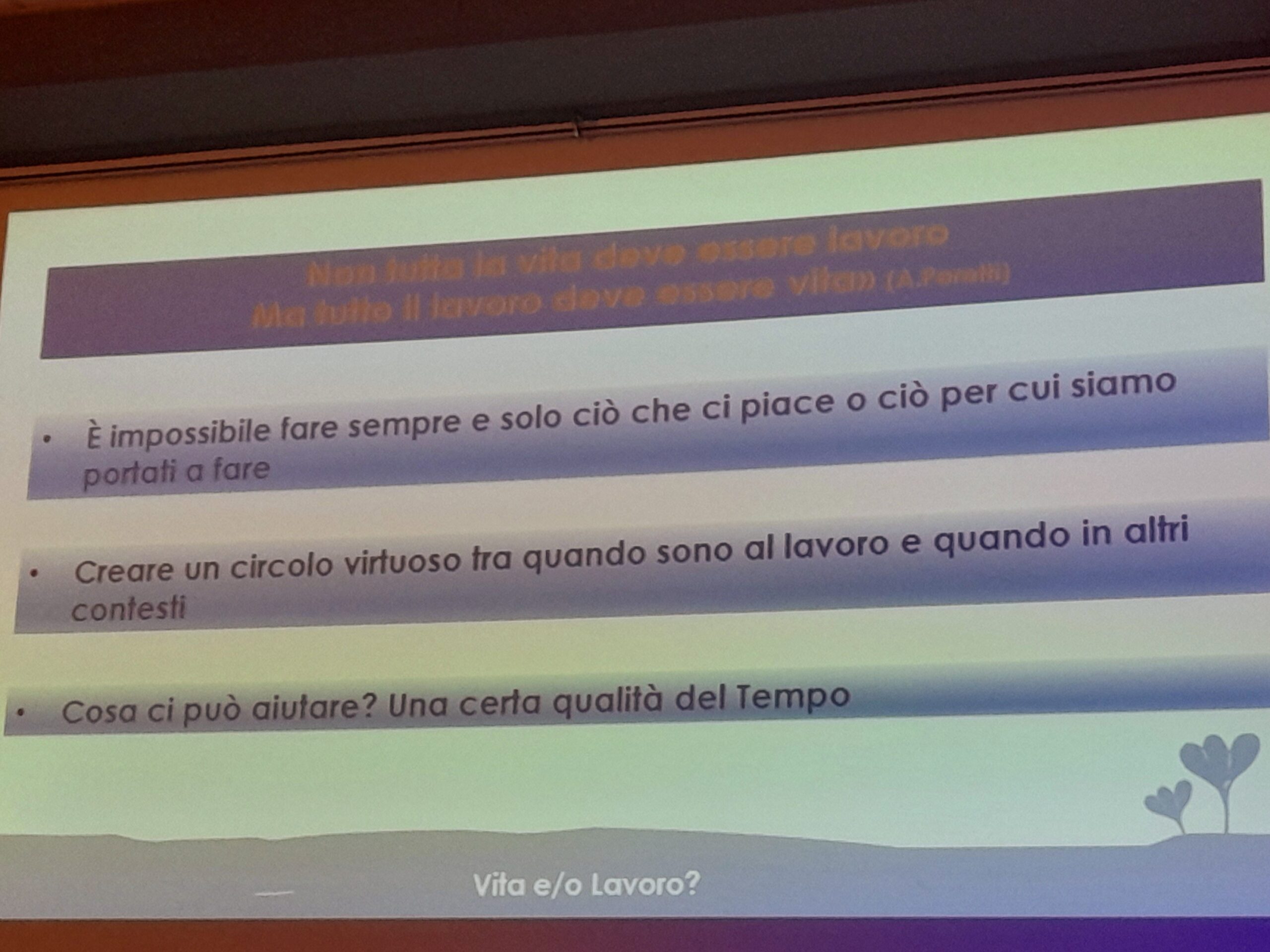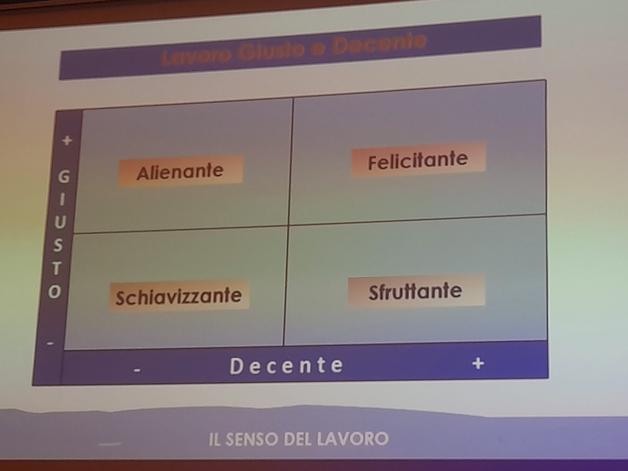 Il formatore ha poi mostrato un grafico esplicativo di come, a seconda della presenza o meno di queste due dimensioni, un lavoro possa risultare alienante (giusto, ma non decente), schiavizzante (né giusto né decente), sfruttante (decente, ma non giusto), felicitante (sia giusto sia decente): «Che nella vita ci sia un lavoro che risulti sempre ed in ogni momento felicitante, non è possibile. Però è chiaro che, se ogni giorno, perennemente, ci sentiamo in uno degli altri quadranti, è necessario riflettere su ciò che stiamo facendo».