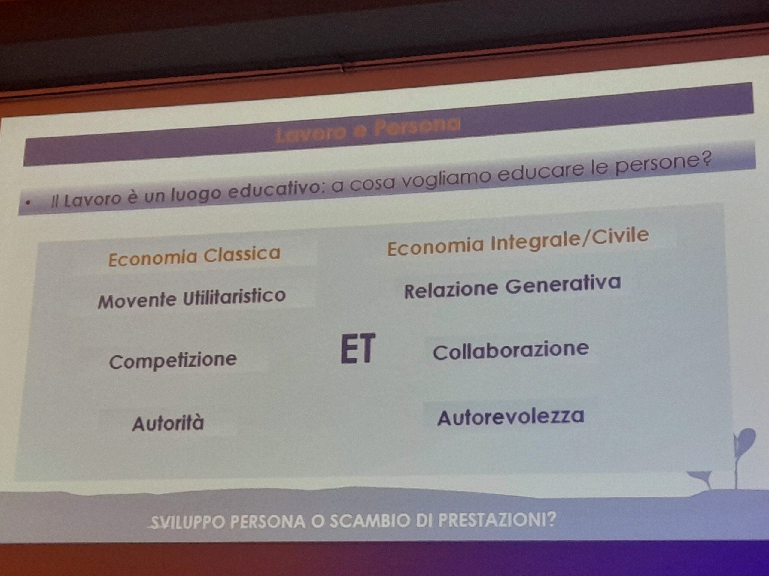 Il monaco benedettino poi, spiegando per quale ragione il lavoro sia da considerare un luogo educativo, ha messo a confronto l’economia classica e quella attuale. Nell’economia classica, in cui è centrale il movente utilitaristico, per raggiungere il profitto sono necessari due strumenti: la competizione sfrenata per ottenere il massimo guadagno e l’autorità per gestire le relazioni. Questa formula funziona: per 250 anni, infatti, è stata un successo e ha tenuto in piedi tutto il sistema industriale. «Oggi, invece, sta cedendo il passo ad un altro tipo di economia – ha precisato Brescianini – un’economia che possiamo definire integrale o civile, nel senso che si occupa della civitas, dei cittadini. Un’economia è civile, non solo quando si occupa dei beni prodotti o dei servizi erogati, ma quando è a servizio delle persone. E noi, persone, siamo mossi dalla ricerca di relazioni generative. Negli ultimi 17 anni ho avuto a che fare con aziende dai 10 ai 24000 dipendenti e, nella maggior parte dei casi, i problemi sono sempre di tipo relazionale. Noi siamo nati per collaborare, non per competere. Anche biologicamente. I nostri organi, ogni giorno, fanno ciascuno la propria parte, per far funzionare bene tutto il corpo. Affinché le relazioni siano improntate alla collaborazione, è necessario che ci sia uno stile autorevole e non autoritario» .