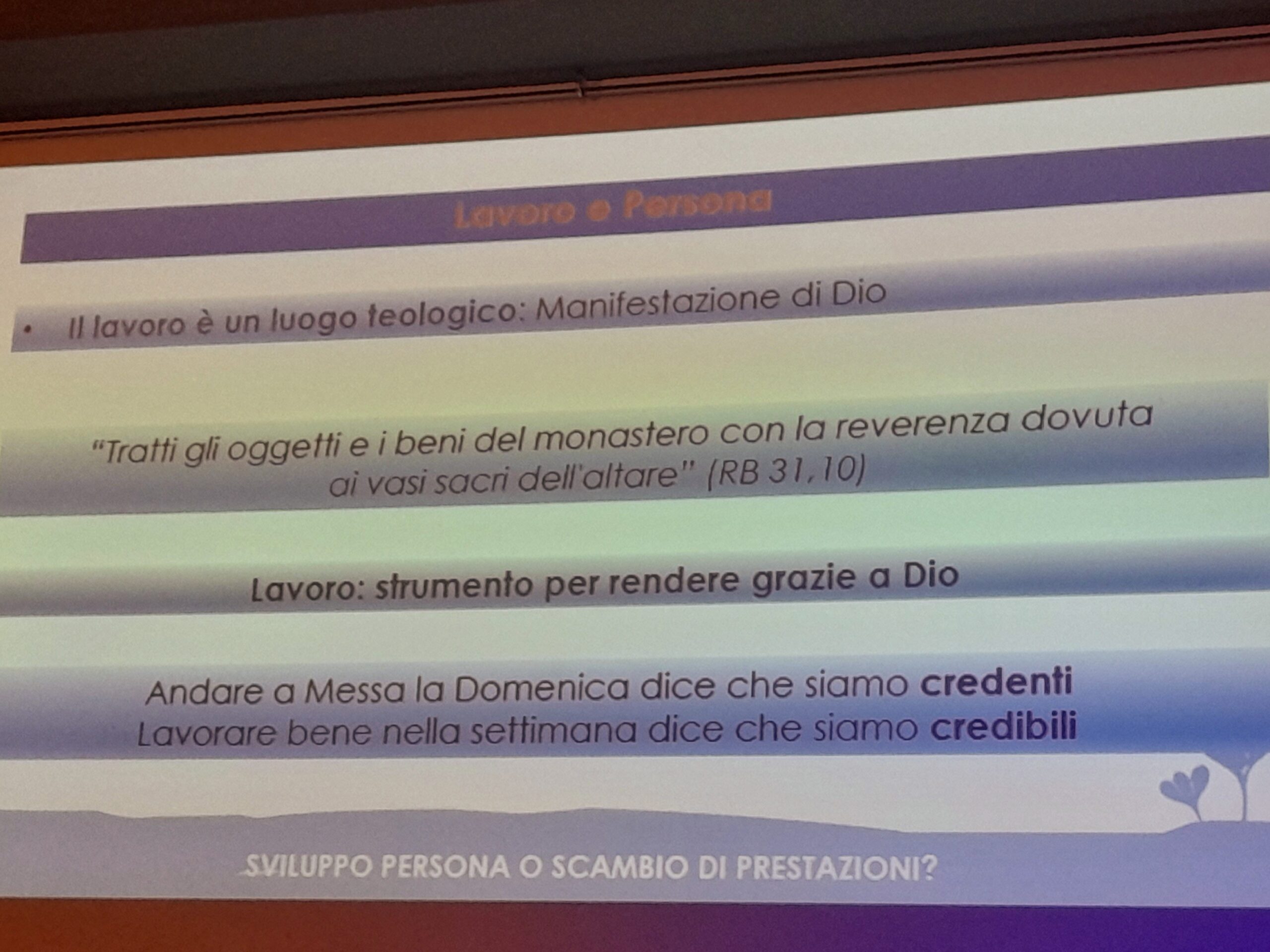 « Nel mio lavoro di coach, ho incontrato colleghi che mi hanno raccontato di grandi manager pagati benissimo, ma che non dormono, hanno la pressione alta, la gastrite e prendono farmaci – ha continuato il monaco benedettino -. In quei casi il corpo ti sta dicendo che, anche se sei un manager super-mega-galattico e prendi un sacco di soldi, tu con quel lavoro non c’entri niente. Quel lavoro non ha niente a che fare con quello che tu sei. Il lavoro alienante alla lunga ti fa ammalare. Un lavoro né giusto né decente, invece, porta alla schiavitù. E non pensate che la schiavitù sia un affare di altre epoche, perché purtroppo esiste anche oggi. Ma anche un lavoro che esprime me stesso, può risultare sfruttante, se non è giustamente retribuito. È quello che spesso accade nel Terzo Settore, nell’ambito di un’economia non profit. Non profit non significa che non debba generare profitto: il profitto è sempre da fare, altrimenti, se così non fosse, qualsiasi attività fallirebbe! La differenza è nella destinazione dei guadagni: nell’economia profit l’imprenditore, il titolare, gli azionisti possono spendere il profitto come vogliono; nell’economia non profit il profitto deve essere reinvestito all’interno dell’associazione. Oggi questi due mondi dell’economia sono chiamati a dialogare». Padre Brescianini ha citato, come esempio virtuoso di questa alleanza tra i due mondi dell’economia, la collaborazione fruttuosa tra la Maserati e la Caritas di Modena, due realtà che apparentemente non c’entrano niente l’una con l’altra, ma che hanno messo in campo ciascuno le proprie risorse: la Caritas le risorse umane, mentre la Maserati le risorse economiche».