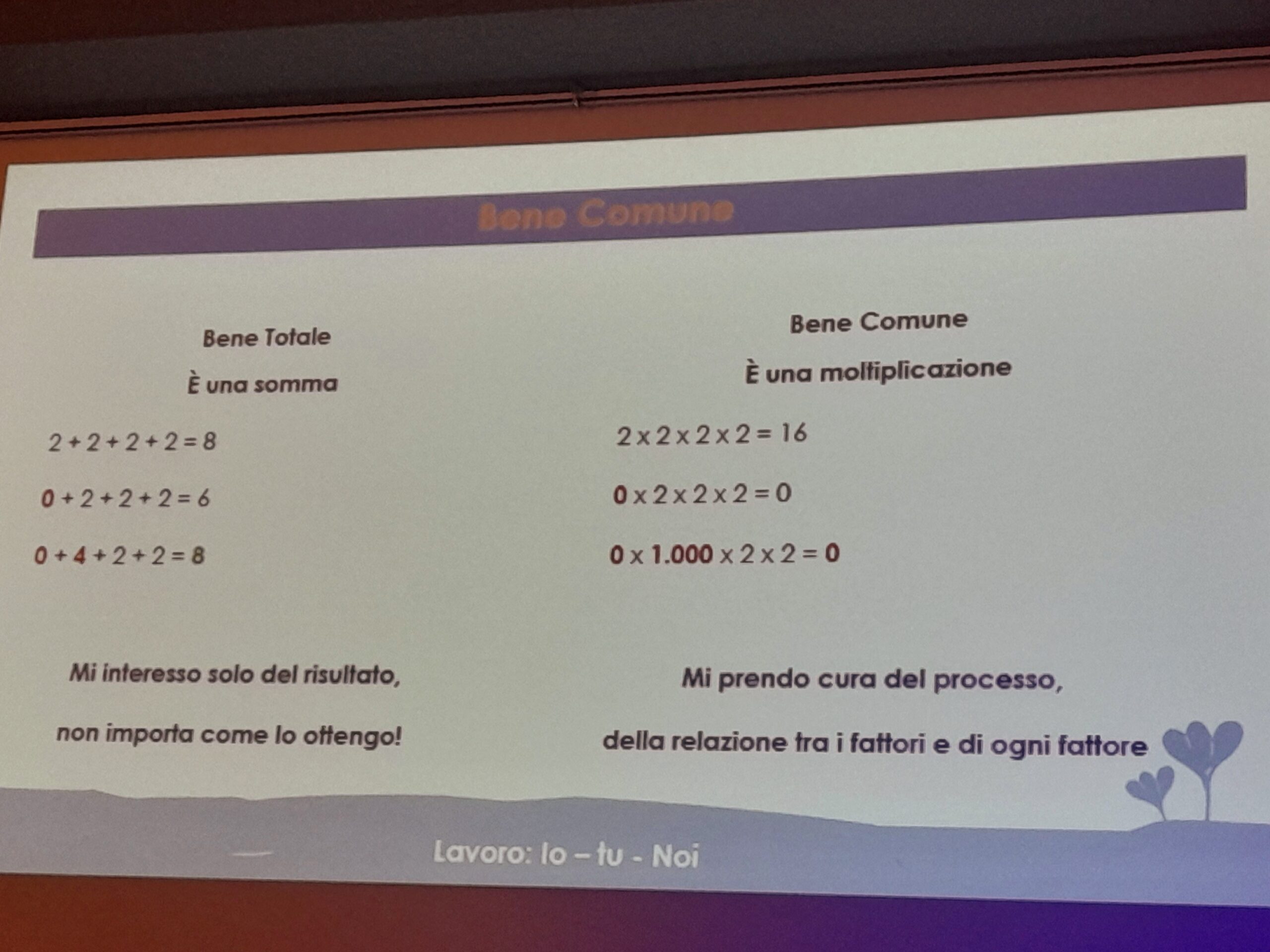 Vedere il bene comune come una moltiplicazione, mi ha portato a prestare particolare attenzione ai vari zeri che si possono creare a causa di diverse situazioni e a contraddire il pensiero che si possa sacrificare qualcosa (o qualcuno) in vista di un qualcosa di più grande.
