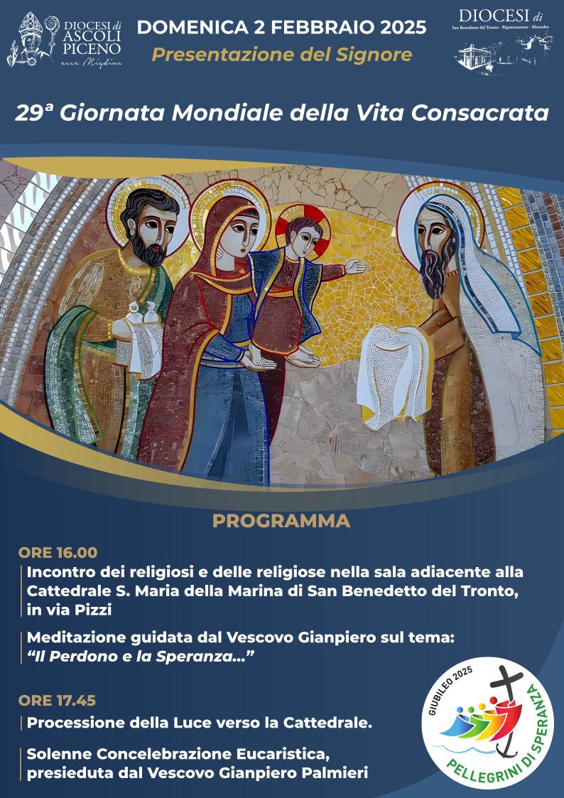 «La Giornata Mondiale della Vita Consacrata è un’occasione propizia per rileggere il nostro cammino di speranza in questo anno Giubilare e l’appuntamento del 2 Febbraio è l’occasione perfetta per unirci come comunità diocesana di Ascoli Piceno e San Benedetto del Tronto, Ripatransone e Montalto. Insieme al nostro vescovo Gianpiero Palmieri, vogliamo, come consacrati, lasciarci illuminare dalla Parola e dalla Luce del Signore.
