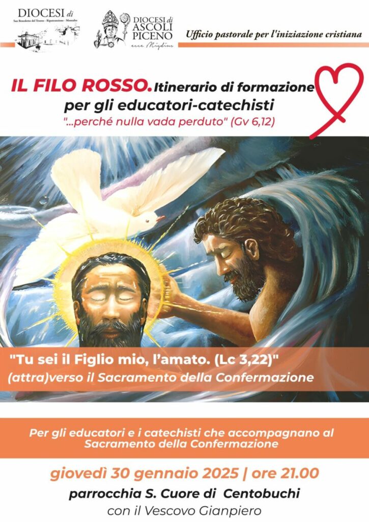 DIOCESI – Questa sera, giovedì 30 gennaio, presso la parrocchia del Sacro Cuore di Gesù a Centobuchi, si terrà il secondo incontro formativo per educatori e catechisti, parte del percorso “Il filo rosso – perché nulla vada perduto”.