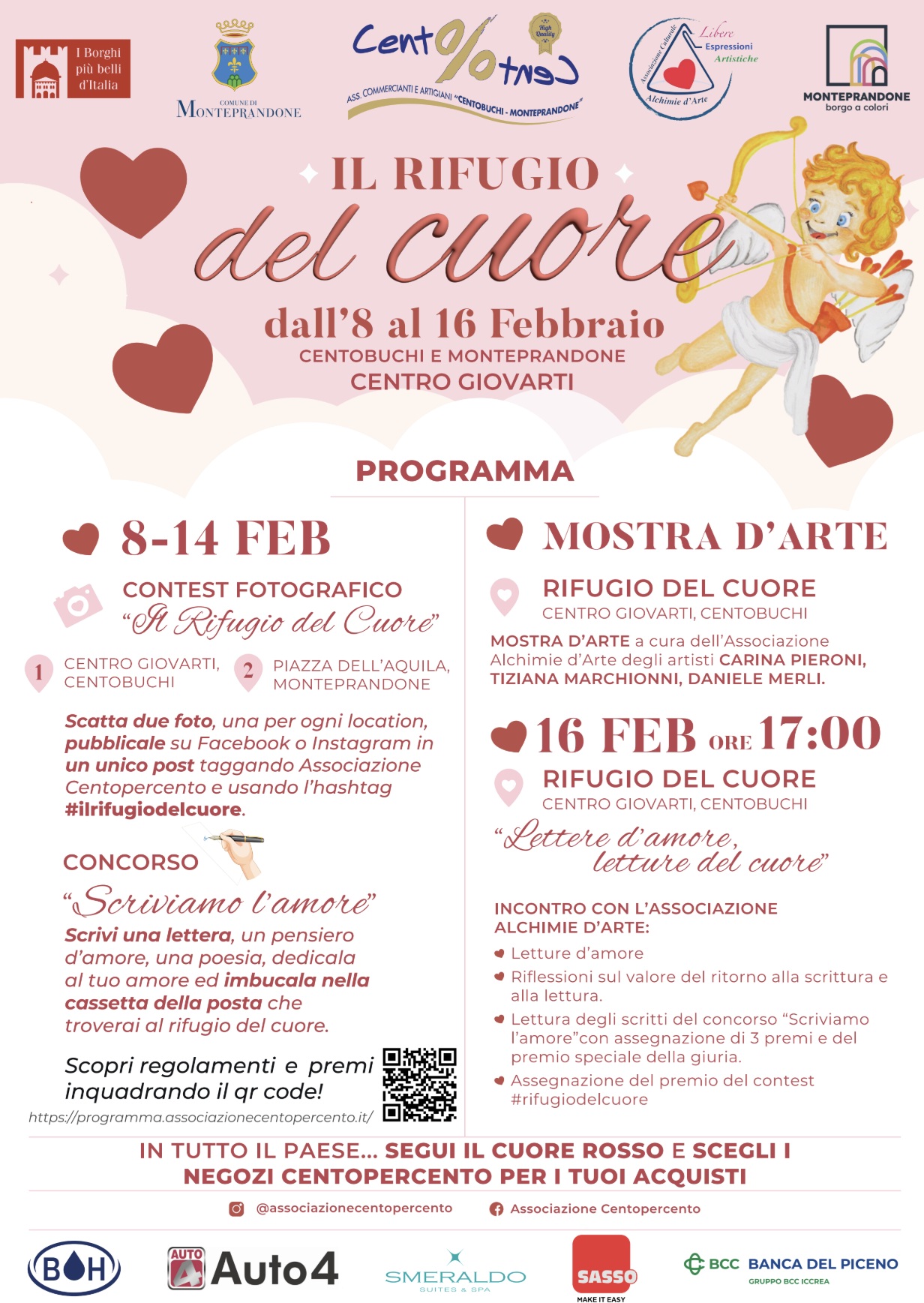 MONTEPRANDONE – Dopo il successo del 2024, torna “Il Rifugio del Cuore”, un luogo magico dove l’amore, l’arte e la passione per la scrittura a mano si fondono, dando vita a una serie di eventi culturali e iniziative commerciali che, partendo dal Centro GiovArti, si diffondono su tutto il territorio di Centobuchi e Monteprandone, celebrando San Valentino, la festa degli innamorati.