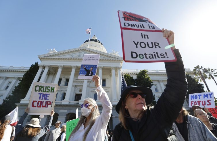 I cartelli che ciascun manifestante tiene in mano spiegano le ragioni della protesta, organizzata online in poche ore e materializzatasi in strada: la repressione dell’immigrazione, dei programmi di pari opportunità riservati a donne, afroamericani, minoranze e anche transgender e appartenenti alla comunità Lgbt. Manifestano contro la proposta di trasferimento forzato dei palestinesi fuori dalla Striscia di Gaza, gridano contro la soppressione di Usaid, l’agenzia di sviluppo internazionale statunitense, contro l’epurazione dei funzionari dell’Fbi, del Dipartimento dell’Istruzione e della Salute e si scagliano senza mezzi termini contro il Progetto 2025, un manuale di estrema destra, scritto da ex collaboratori di Trump e diventato il codice per modificare l’ordinamento del governo e la società americana. Si oppongono all’uscita dal Patto di Parigi sul cambiamento climatico, alle politiche sui combustibili fossili e alla guerra commerciale con Canada e Messico, nonostante lo stesso Trump, nella sua prima amministrazione, avesse ridefinito le politiche di scambio con i due Paesi, annullando il Nafta (North American Free Trade Agreement) e riproponendo un trattato nuovo di zecca nel 2020, l’Usmca.