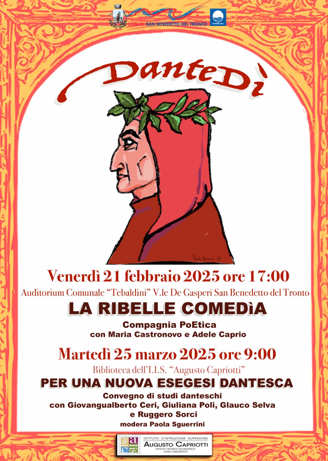 SAN BENEDETTO DEL TRONTO – Doppio appuntamento per il DanteDì organizzato dall’Istituto Augusto Capriotti di San Benedetto del Tronto: venerdì 21 febbraio presso l’Auditorium Tebaldini il Dirigente Scolastico, prof. Enrico Piasini, ospiterà la Compagnia PoEtica, con la dantista prof.ssa Maria Castronovo, che ha scoperto i disegni segreti celati nel poema, e Adele Caprio, laureata in lingue, in regia presso il DAMS di Bologna e in psicologia, attrice (ha studiato all’Actor’ Studios di New York) e pedagogista, le quali doneranno un’originale e illuminante lettura della Commedia dell’Alighieri con “La ribelle Comedìa”, ingresso libero.
