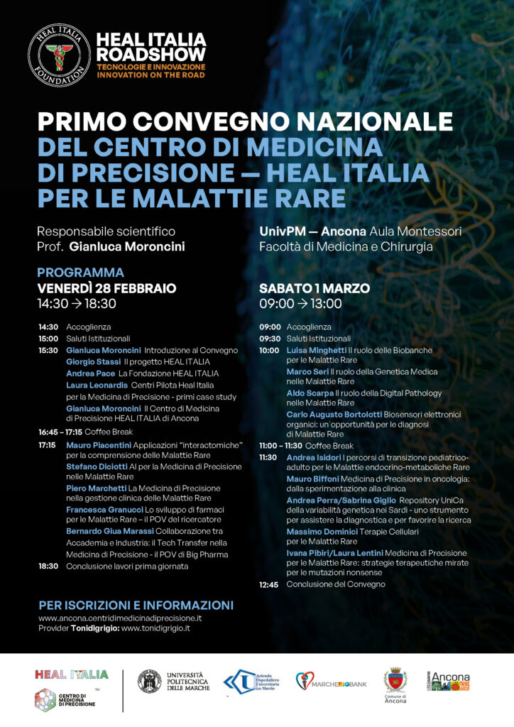 MARCHE – Ancona diventa la porta di accesso per percorsi diagnostici e terapeutici innovativi dei pazienti con malattie rare, grazie alla Medicina di Precisione. Nasce, nel capoluogo delle Marche, il primo Centro di Medicina di Precisione – HEAL ITALIA dedicato allo sviluppo della medicina di precisione nelle Malattie Rare realizzato al Dipartimento di Scienze Cliniche e Molecolari dell’Università Politecnica delle Marche, diretto dal Prof. Gianluca Moroncini. Le attività inizieranno ufficialmente il 28 febbraio e il 1° marzo con il Primo Convegno di Medicina di Precisione – HEAL ITALIA per le Malattie Rare organizzato nell’Aula Montessori della Facoltà di Medicina e Chirurgia ad Ancona. Il convegno, con il Prof. Gianluca Moroncini come responsabile scientifico, è aperto non solo alla comunità medica e scientifica ma anche ai pazienti con malattie rare, familiari e care giver. Il Convegno, organizzato tra l’ultimo giorno di febbraio e il primo di marzo in occasione della Giornata Mondiale delle Malattie Rare (che da calendario è il 29 febbraio, data identificata per la sua bassa frequenza), segna sì l’inizio delle attività del Centro di Medicina di Precisione HEAL ITALIA di Ancona, ma rappresenta anche la quarta tappa dell’HEAL ITALIA Roadshow, un tour itinerante che la Fondazione HEAL ITALIA ha avviato lo scorso mese di ottobre 2024, dedicato al rafforzamento della partnership e alla divulgazione delle attività della Fondazione non solo agli addetti ai lavori ma anche alle istituzioni, alle persone affette da malattie e alle loro associazioni, e alla società civile tutta.