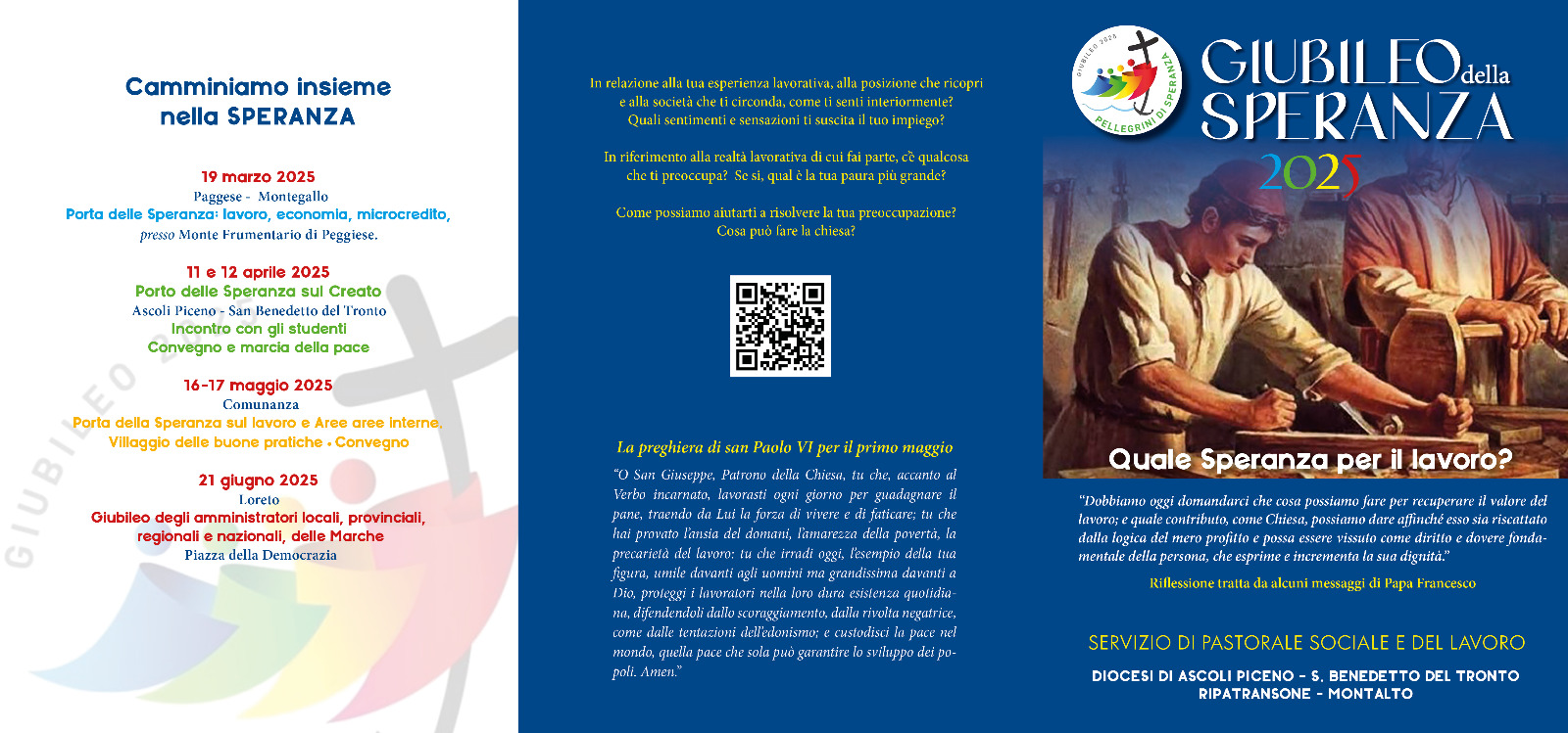 Insieme alla lettera e al pieghevole, verrà consegnato anche il calendario degli eventi dal titolo “Camminiamo insieme nella speranza”, che contiene tutte le iniziative che si svolgeranno nelle due Diocesi Picene in questo Anno Giubilare e che riguarderanno la Pastorale Sociale, del Lavoro e della Cura del Creato.