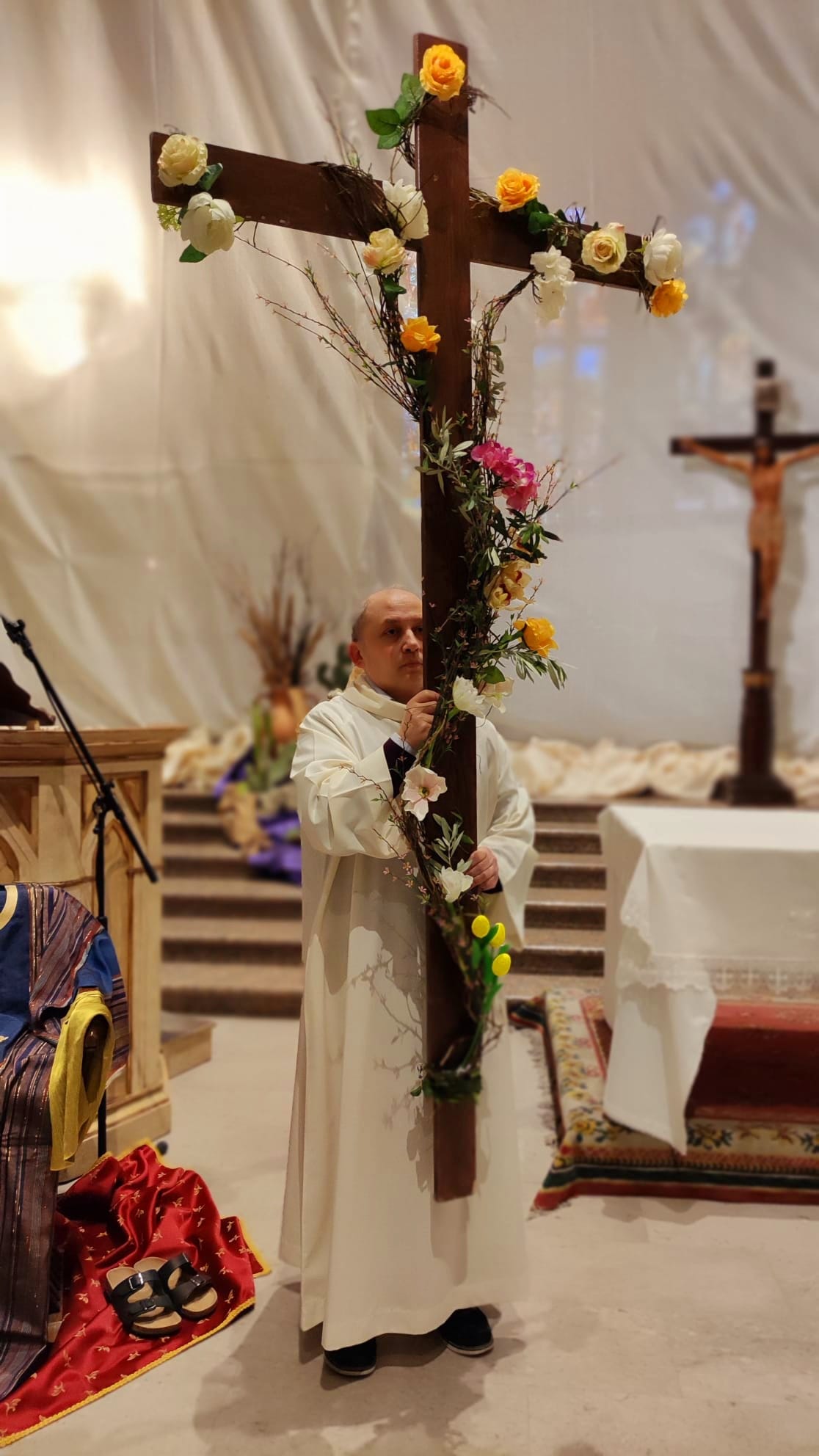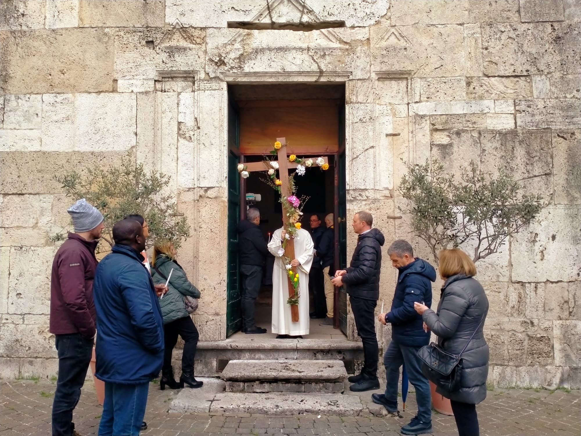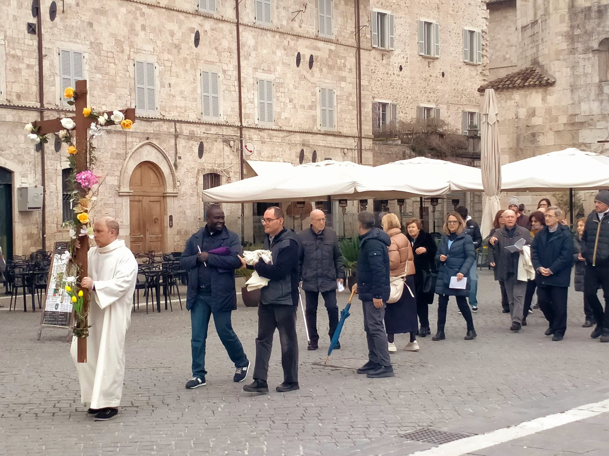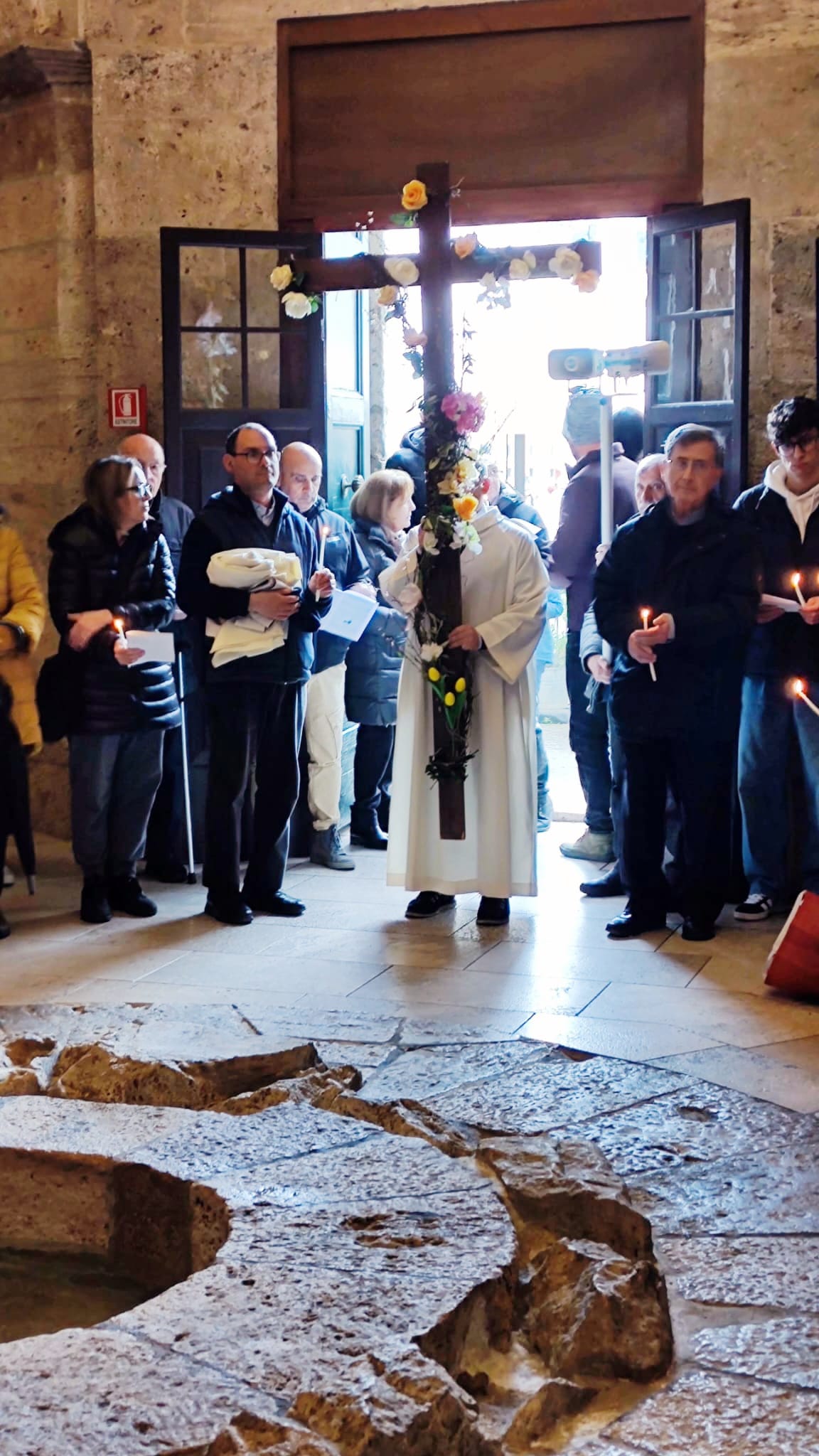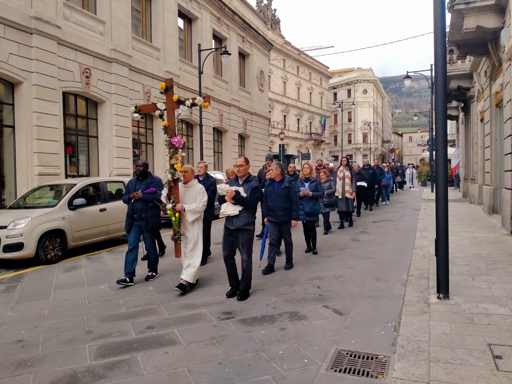 La seconda tappa è stata il pellegrinaggio a piedi fino alla chiesa di San Francesco. Il corteo è stato preceduto dalla croce ornata di fiori in segno di festa e di speranza.