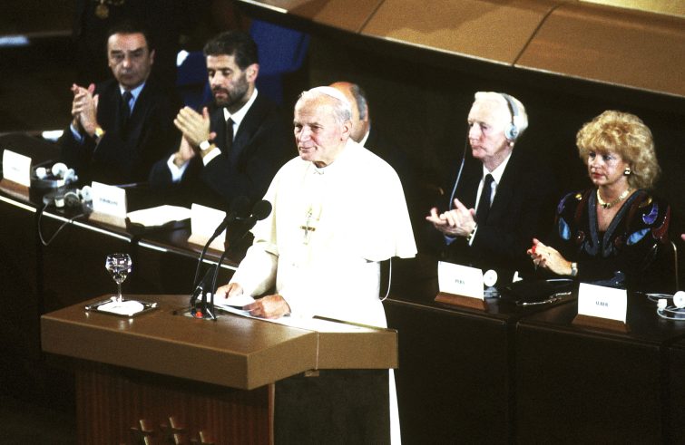 Giovanni Paolo II, prendendo la parola dal podio dell’Europarlamento, da pochi anni eletto a suffragio universale (si era già rivolto all’Assemblea parlamentare del Consiglio d’Europa tre giorni prima), ne riconosce il “prestigio” e “un’autorità accresciuti”,apparendo ai cittadini “come l’istituzione portante del loro avvenire, come una comunità democratica […] desiderosa di integrare più fortemente la sua economia, di armonizzare in molti punti la sua legislazione e di offrire a tutti i suoi cittadini uno spazio unico di libertà in una prospettiva di mutua cooperazione e arricchimento culturale”. Il Papa assegna poi all’allora Comunità economica europea, composta in quel momento da 12 Stati, un ruolo e una vocazione sorgiva alla pace, alla democrazia, ai diritti fondati “sulla dignità della persona” e una necessaria apertura al mondo e alla cooperazione internazionale con un impegno speciale a favore dello sviluppo dei Paesi poveri.