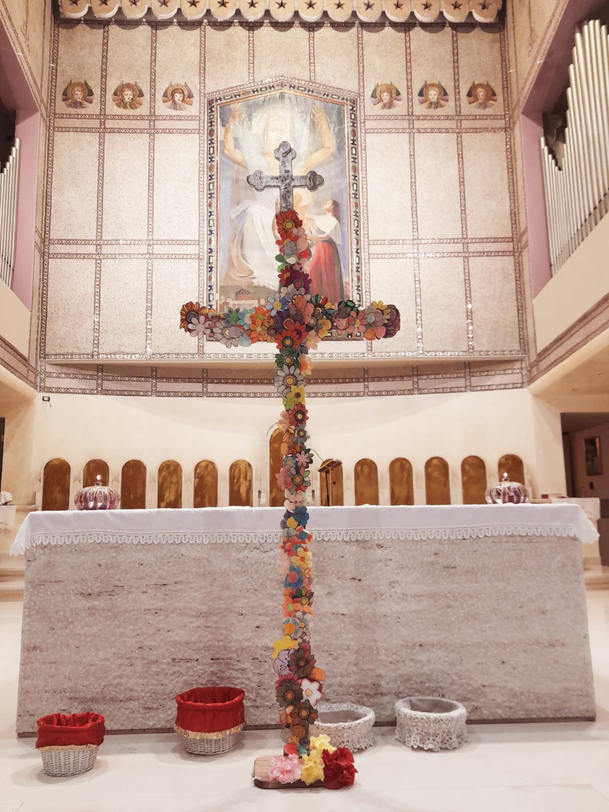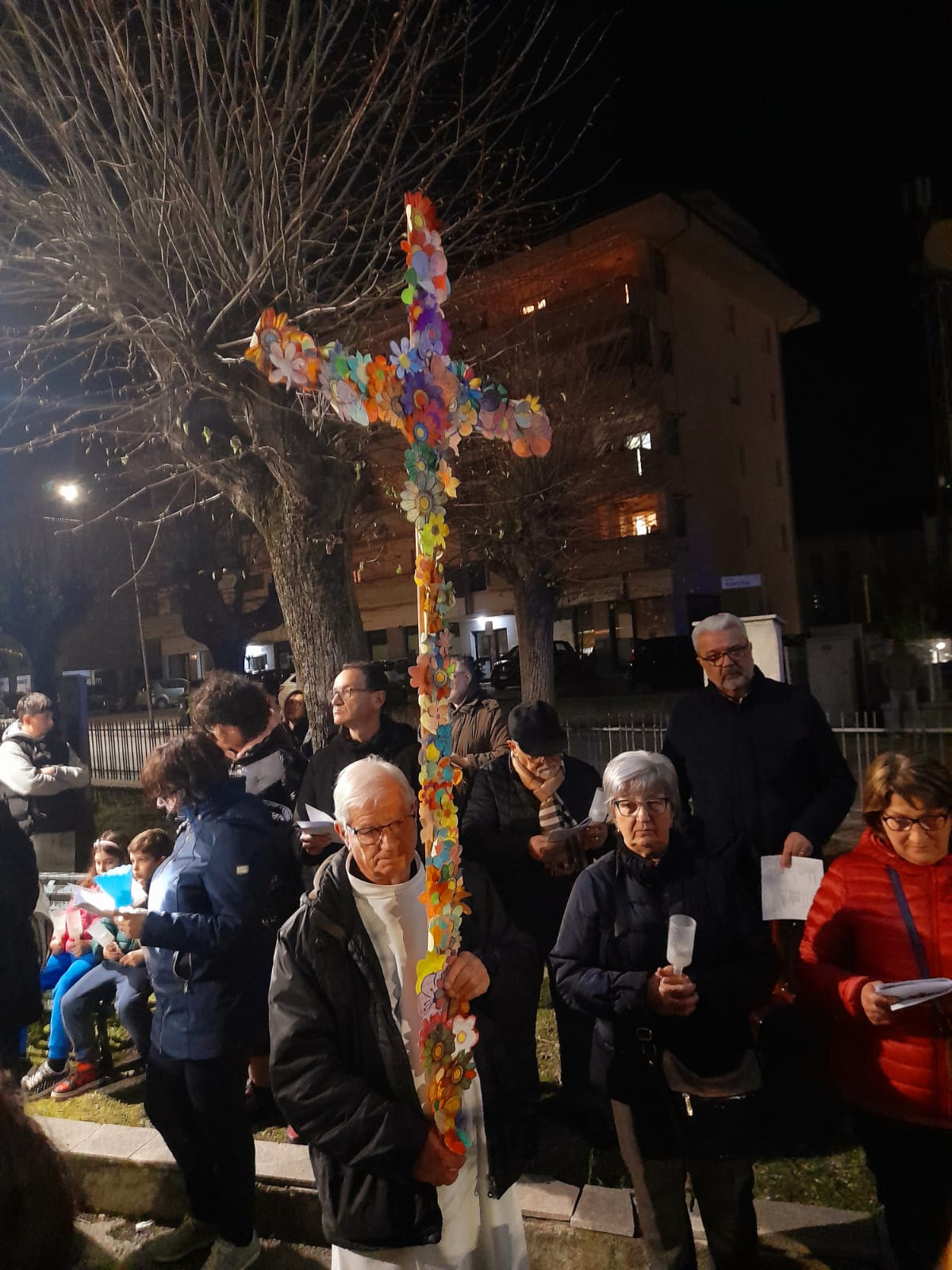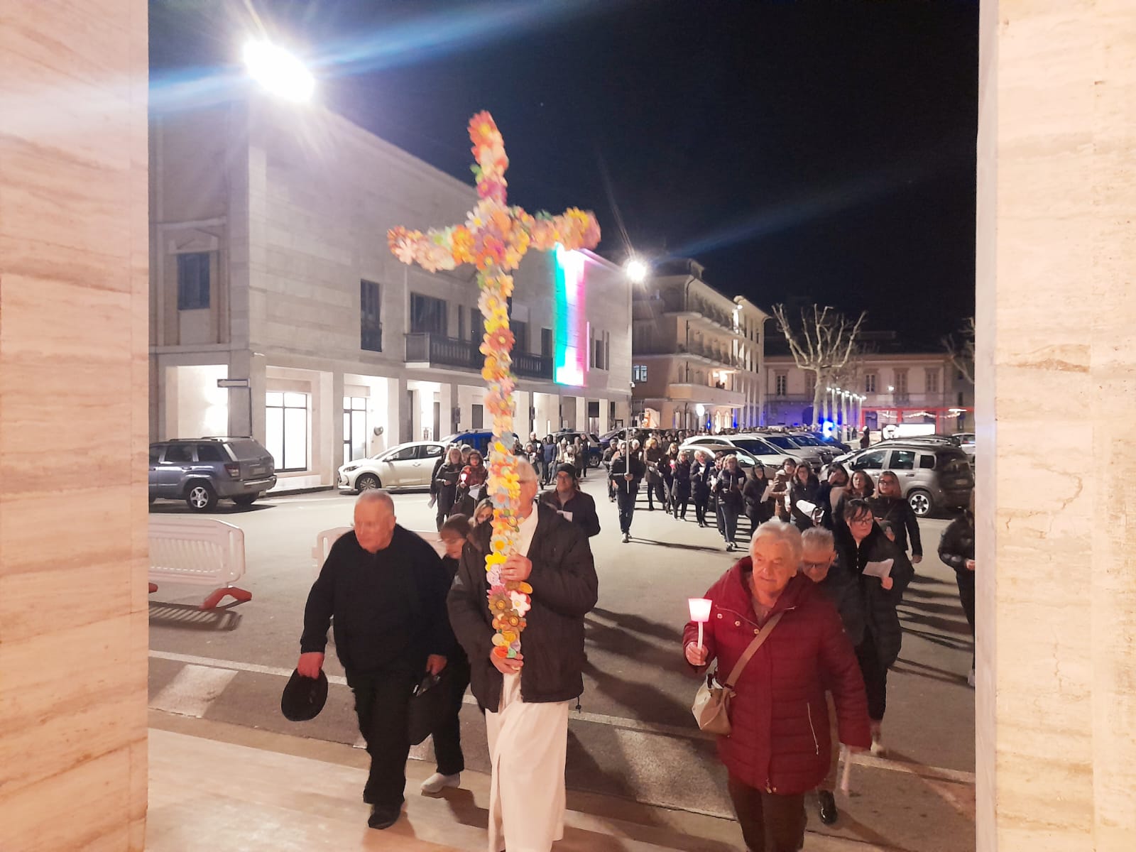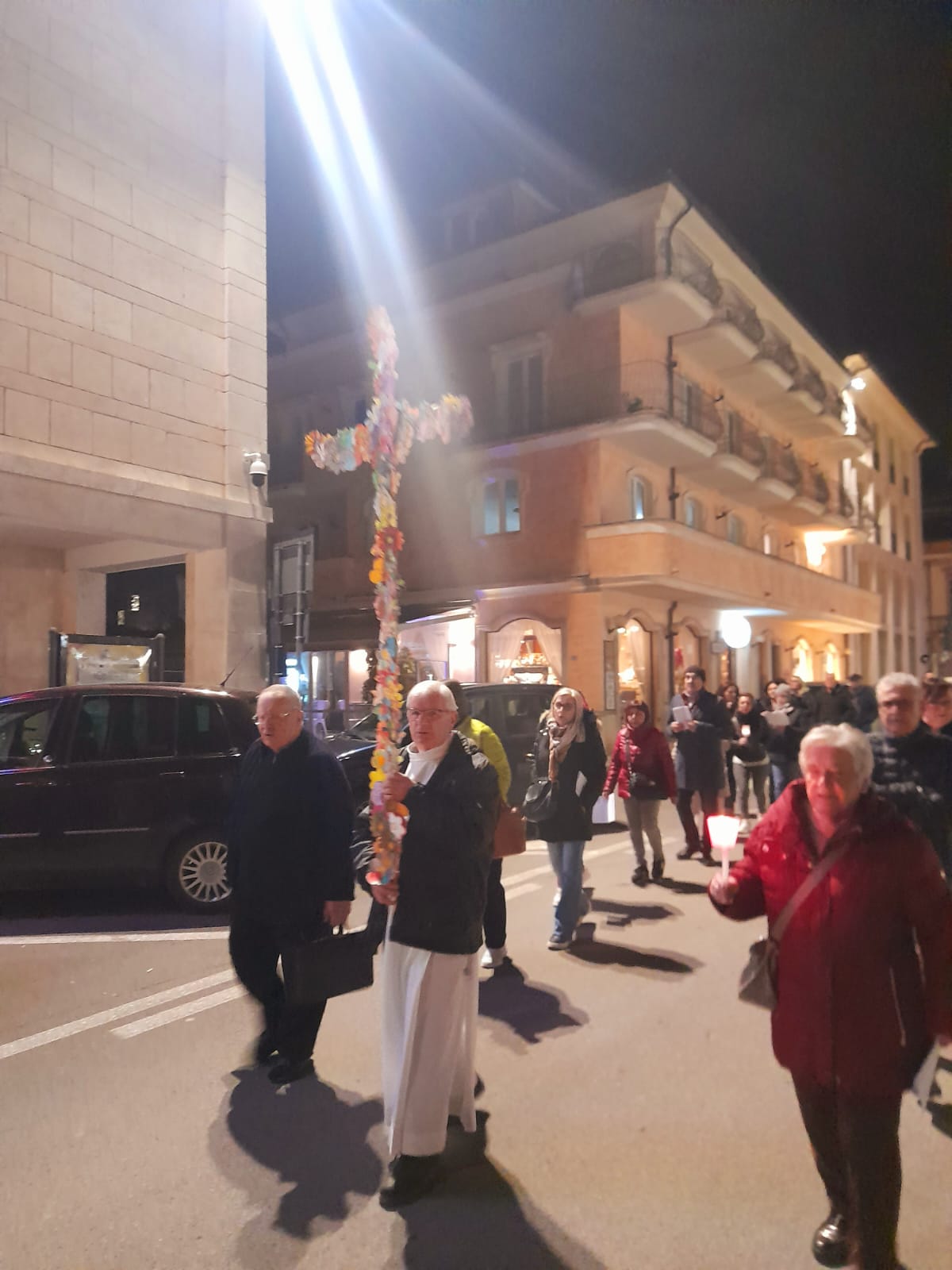 A seguire è iniziato il pellegrinaggio a piedi fino alla chiesa Sacro Cuore di Gesù. Il corteo è stato preceduto dalla croce ornata con tanti fiori di carta colorati, realizzati dai bambini del catechismo in segno di festa e di speranza. Numerosi i ragazzi e i giovani che hanno partecipato. Lungo il cammino tutti i pellegrini – adulti, giovani e anziani – hanno potuto riflettere sulla loro vita e sulla loro fede, pregando alcuni Salmi e cantando le litanie dei Santi.