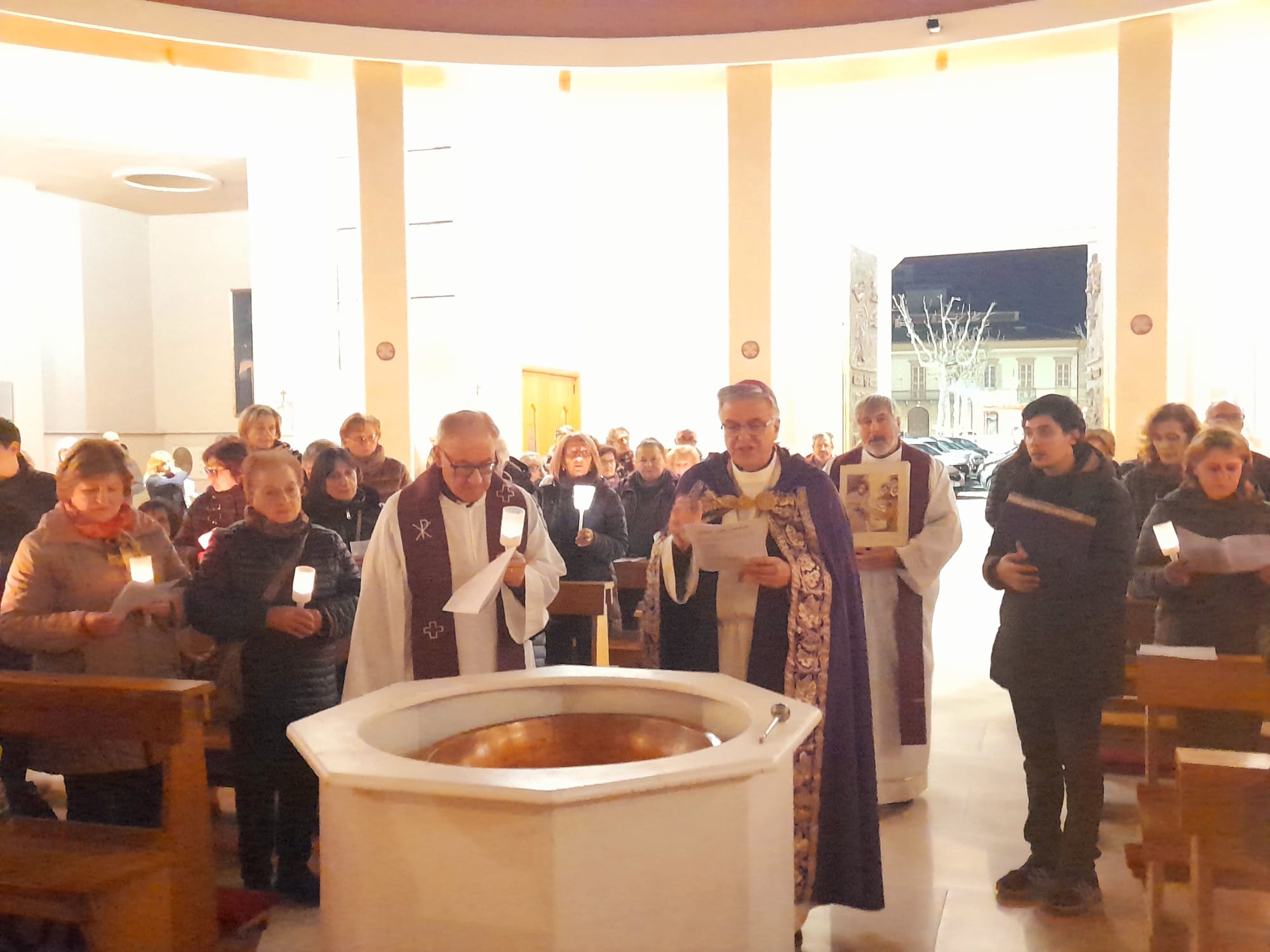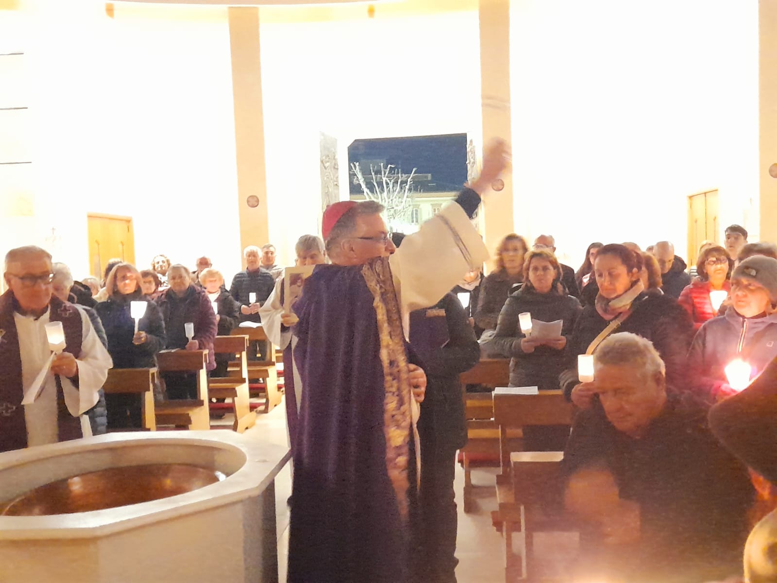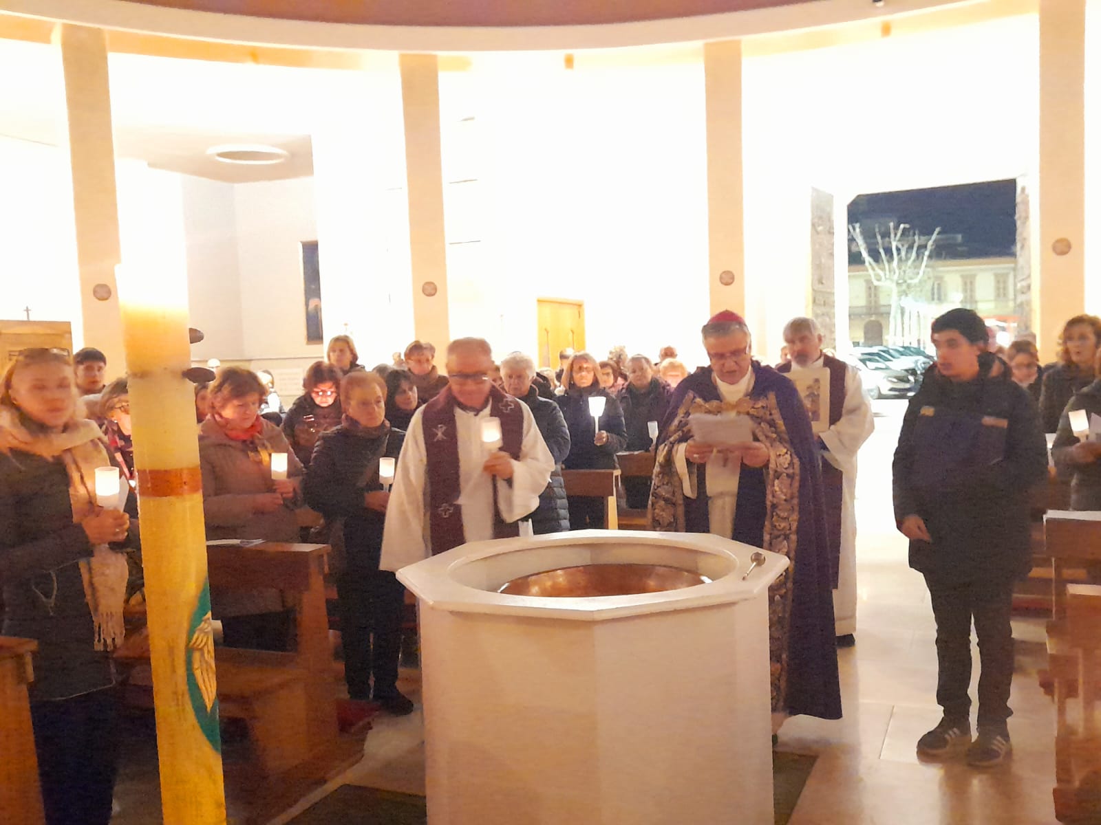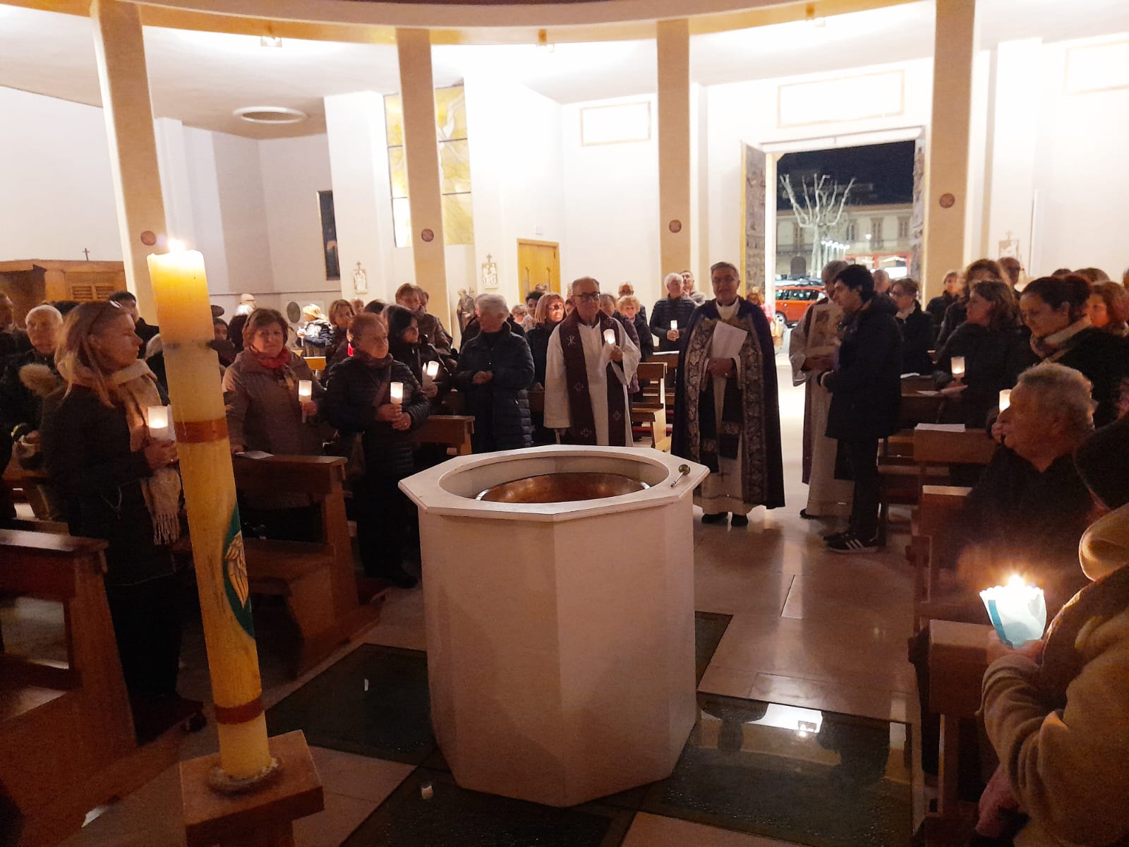Giunti presso la chiesa Sacro Cuore di Gesù, illuminata solo dalla luce delle candele accese dei fedeli, i pellegrini hanno fatto memoria del Battesimo.