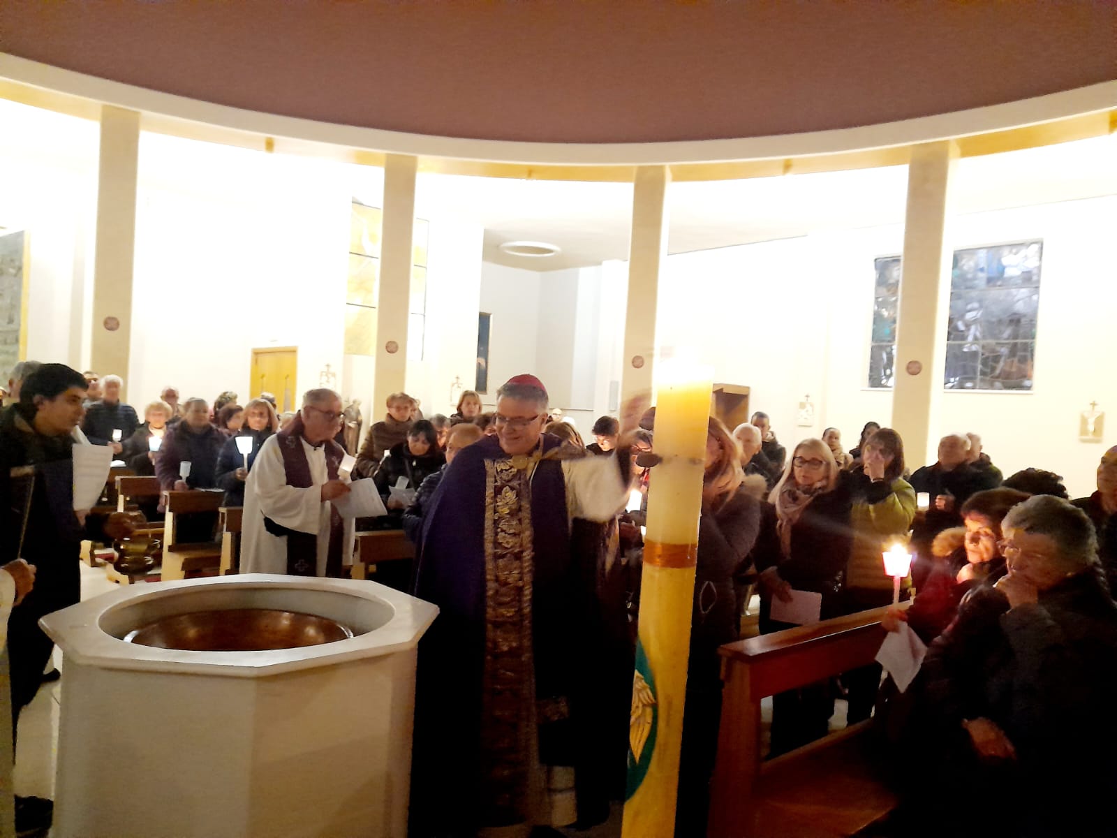 Il vescovo Gianpiero, avvicinatosi al fonte battesimale, ha detto: “Abbiamo camminato con Gesù, che ci dice: ‘Io sono con voi tutti i giorni, fino alla fine del mondo’. Nella nostra vita, camminando, camminiamo sempre con Lui, anche quando non ce ne accorgiamo. E camminiamo con gli altri, giorno dopo giorno, passo dopo passo, chiedendo alla Potenza del Signore Risorto di far crescere in noi la fede, la speranza e l’amore. Ma all’inizio della nostra vita ci è stato fatto un dono per mezzo dello Spirito: siamo stati cioè immersi in Gesù Risorto, battezzati in Gesù Risorto, per formare un solo corpo con Lui e con tutta la Chiesa. C’è stata donata la fede, simboleggiata dalla candela accesa. Stasera allora vogliamo rinnovare le promesse del nostro Battesimo, facendo la rinuncia al male e facendo la nostra professione di fede”.