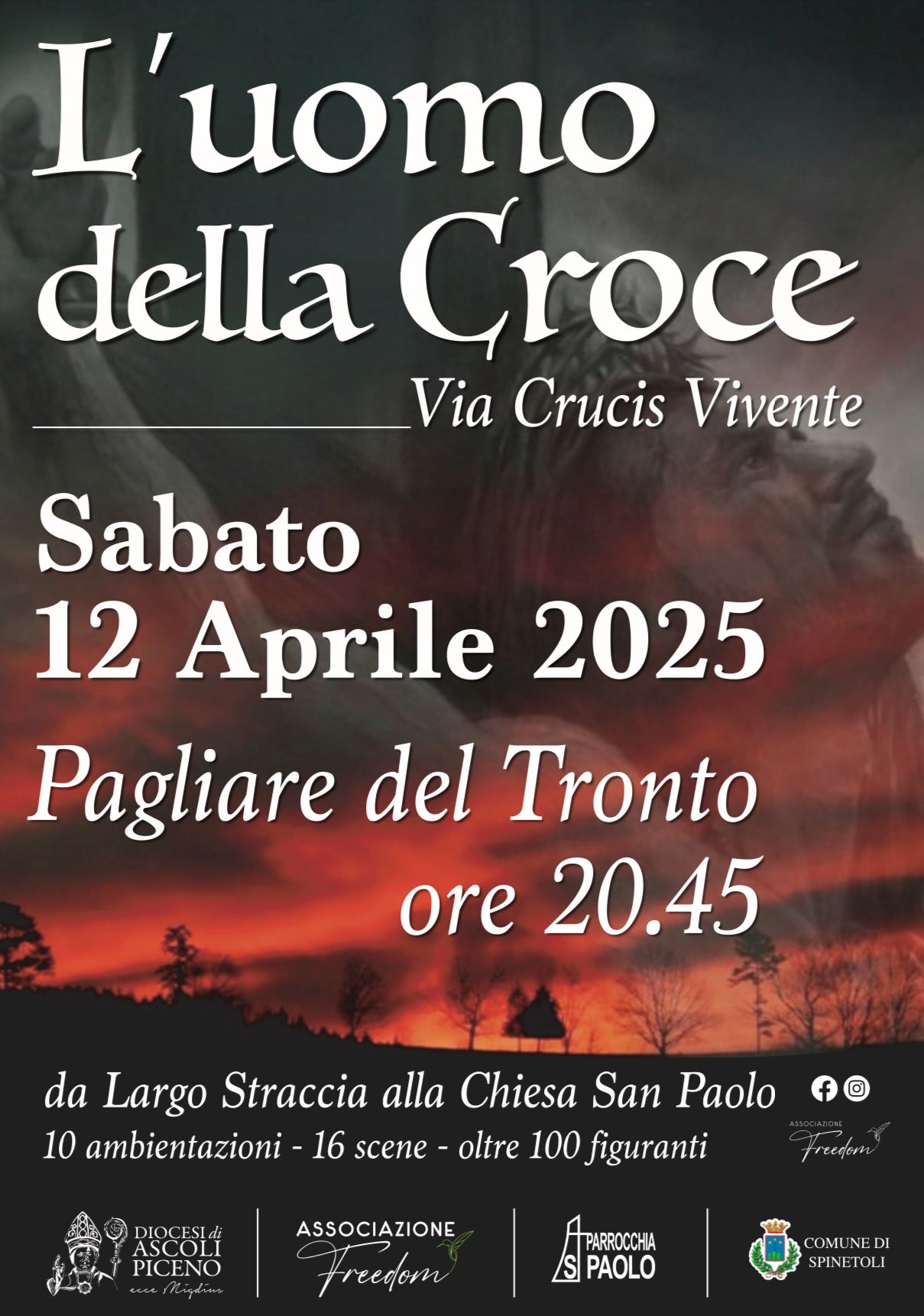 SPINETOLI – Si rinnova anche quest’anno l’ormai tradizionale appuntamento con “L’uomo della croce”, la Via Crucis vivente promossa dall’associazione Freedom in collaborazione con la parrocchia di San Paolo a Pagliare del Tronto e l’Amministrazione comunale di Spinetoli.