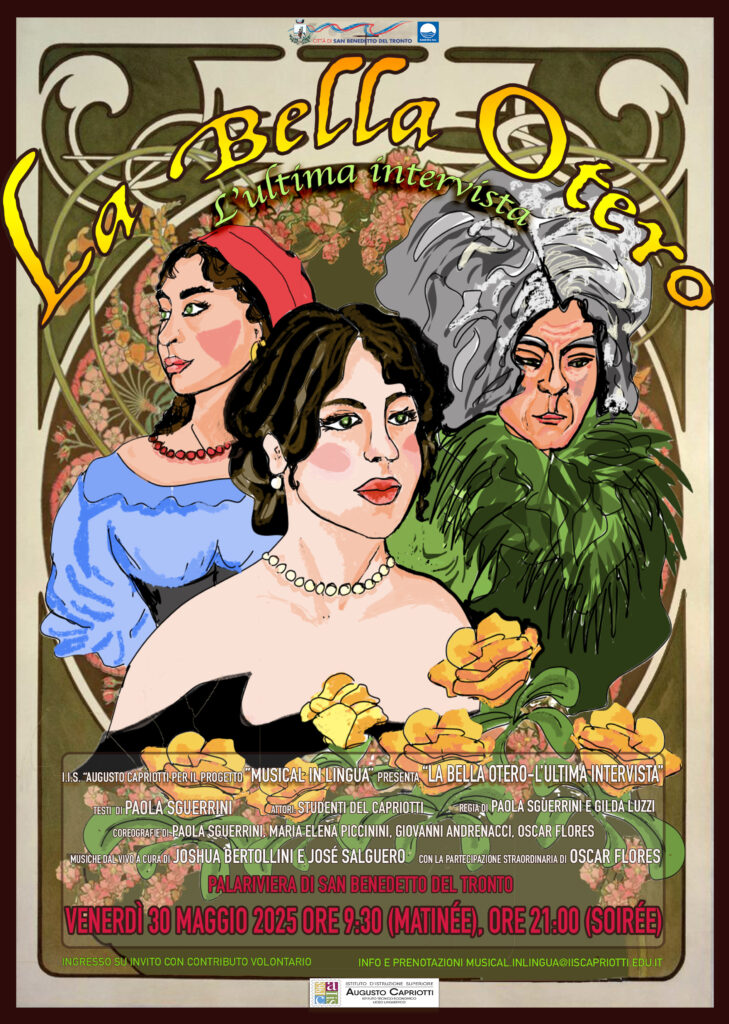 SAN BENEDETTO DEL TRONTO – Il laboratorio “Musical in lingua”, progetto allegato al P.T.O.F., il 30 maggio 2025 metterà in scena al Palariviera di San Benedetto del Tronto “La Bella Otero-L’ultima intervista”, il musical in cinque lingue, diretto, scritto e coreografato dalla prof.ssa Paola Sguerrini in collaborazione con la dott.ssa Gilda Luzzi, con gli insegnanti del Dipartimento di Lingue straniere, con i musicisti Joshua Bertollini, tenore e pianista, José Salguero, cantaor flamenco, e il maestro di ballo Giovanni Andrenacci.