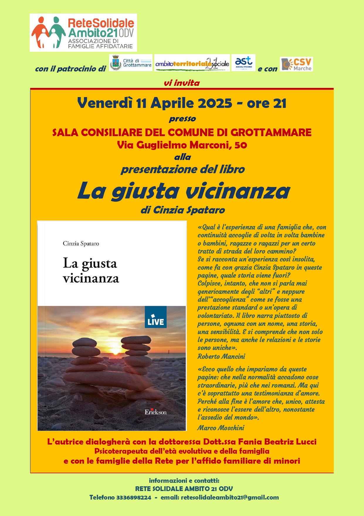 GROTTAMMARE – Oggi, venerdì 11 aprile, alle ore 21:00, la sala consiliare del Comune di Grottammare ospiterà un evento toccante e significativo promosso dall’associazione “Rete Solidale Ambito21”: la presentazione del libro La giusta vicinanza di Cinzia Spataro, un’opera che dà voce all’esperienza profonda e spesso invisibile delle famiglie che accolgono bambini e ragazzi in situazioni di fragilità.