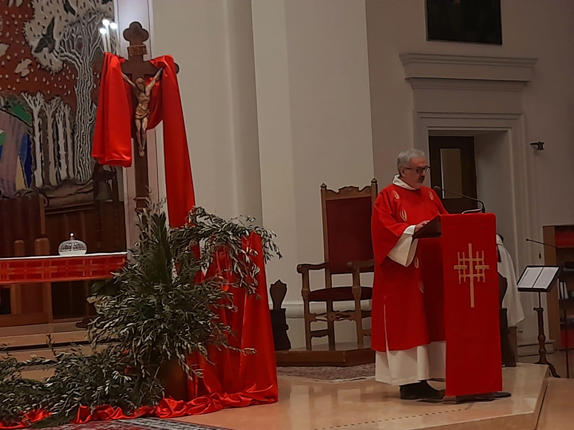 Dopo il racconto della Passione di Gesù secondo l’evangelista Luca, la cui lettura è stata affidata ai tre diaconi presenti, mons. Palmieri, durante la sua omelia, ha evidenziato come il racconto di Luca sottolinei la tenerezza dell’amore di Dio attraverso tanti particolari a cui gli altri evangelisti non pongono attenzione: “Nell’ingresso di Gesù a Gerusalemme, il popolo organizza l’ingresso del Re nella città. Si tratta di un re mite, che è su un puledro di asino, non su un cavallo. Un re che scoppia a piangere e dice: ‘O Gerusalemme, come sarebbe stato bello se tu avessi compreso Colui che ti porta la via della pace!’. Arrivato nel tempio, poi farà la purificazione del tempio dai venditori, perché il tempio fosse luogo di preghiera per tutti. La tenerezza di Gesù, che si vede in questo suo commuoversi e in questo voler radunare tutti i figli di Gerusalemme sotto le sue ali, si realizzerà pienamente proprio durante la sua morte, quando allargherà le braccia sulla croce, quando le allargherà all’infinito per accogliere tutti i popoli nel suo abbraccio, quando stenderà le ali e abbraccerà tutti. Sembrerà che le sue braccia siano inchiodate alla croce, invece no: Gesù stenderà le sue ali e, nel momento in cui Gesù spiccherà il volo, sarà il volo di Dio, sarà la vita di Dio, sarà la Resurrezione. Nel momento in cui aprirà e braccia, raccoglierà tutti gli uomini e tutto l’uomo nel suo abbraccio d’amore“.
