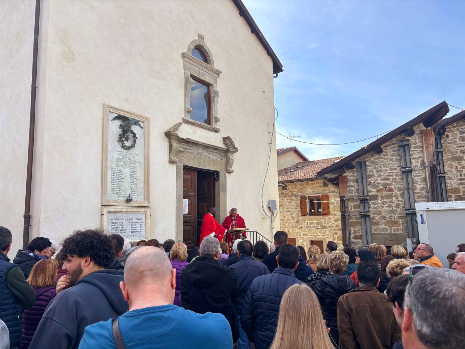 ARQUATA DEL TRONTO – Grande gioia ad Arquata del Tronto per la riapertura al culto della chiesa nella frazione di Spelonga, che era divenuta inagibile a seguito del sisma del 2016. Sabato 12 Aprile 2025, alle ore 16:00, i fedeli si sono radunati davanti all’edificio sacro per la benedizione delle palme e la Celebrazione Eucaristica presieduta dall’arcivescovo Gianpiero Palmieri e concelebrata dal parroco don Emmanuel Chemo. Presenti, tra la numerosa folla accorsa, anche Michele Franchi, sindaco di Arquata del Tronto, Luigi Contisciani, presidente del BIM Tronto, Loreto Camacci, priore della Confraternita del Santissimo Rosario, Massimo Di Vittori, presidente del Comitato “Festa Bella” di Spelonga e Santese in carica, insieme a Roberto Ciancotti, Corrado Longa e Silvano Camacci.