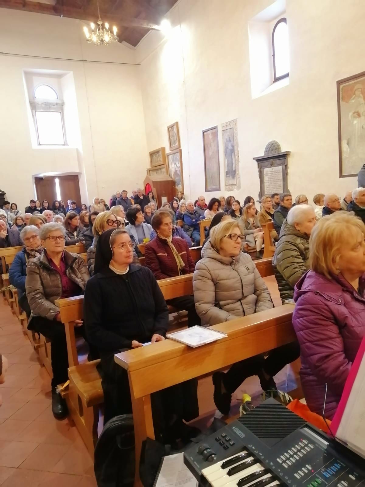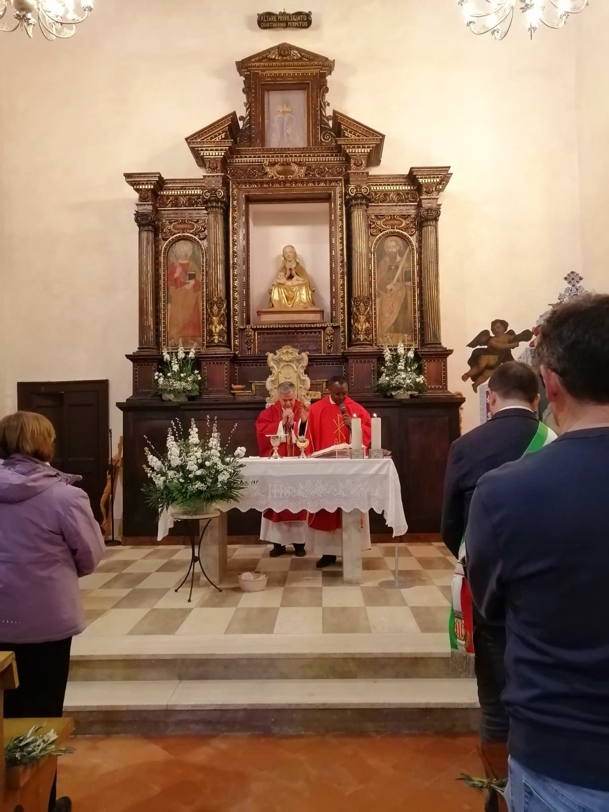 Queste le parole del vescovo Palmieri durante l’omelia: “Noi siamo qui a celebrare il Mistero Pasquale in questa Domenica delle Palme ed è un giorno particolarmente significativo per Spelonga, perché riapriamo al culto questa chiesa che è stata chiusa per tanto tempo. Noi sappiamo che questa chiesa contiene la testimonianza della fede, dei nostri progenitori, dei nostri nonni e bisnonni, di generazioni intere di cristiani che hanno vissuto in questo territorio, che hanno ascoltato questo racconto, il racconto della Passione di Dio, della Passione di Gesù e lo hanno rappresentato anche negli affreschi che sono nelle nostre pareti. Qui davanti a noi c’è il racconto della Passione in più quadri e poi l’immagine molto bella del Cristo deposito nella tomba, un’immagine antichissima che si chiamava «Donna, perché piangi?». Ci sono tanti segni di testimonianza della fede degli abitanti di Spelonga e noi siamo qui a dare continuità a questa comunità e a questa fede. Possiamo attraversare i secoli, possiamo attraversare le vicende dolorose e buie della vita, possiamo vivere le catastrofi come quella del terremoto, ma sempre la nostra comunità cristiana riparte e riprende la sua vita, perché vive per la fede in Dio. E per la fede nel figlio di Dio, morto e risorto, vive nell’energia, nella forza, nella luce che lo Spirito, Spirito Santo, che è lo Spirito di Gesù risorto, mette nel nostro cuore. Per questo non ci rassegniamo, per questo lottiamo, per questo andiamo avanti, perché siamo afferrati dallo Spirito di Gesù risorto che si rialza in piedi dalla tomba e ricomincia il cammino di Dio in mezzo a noi”.