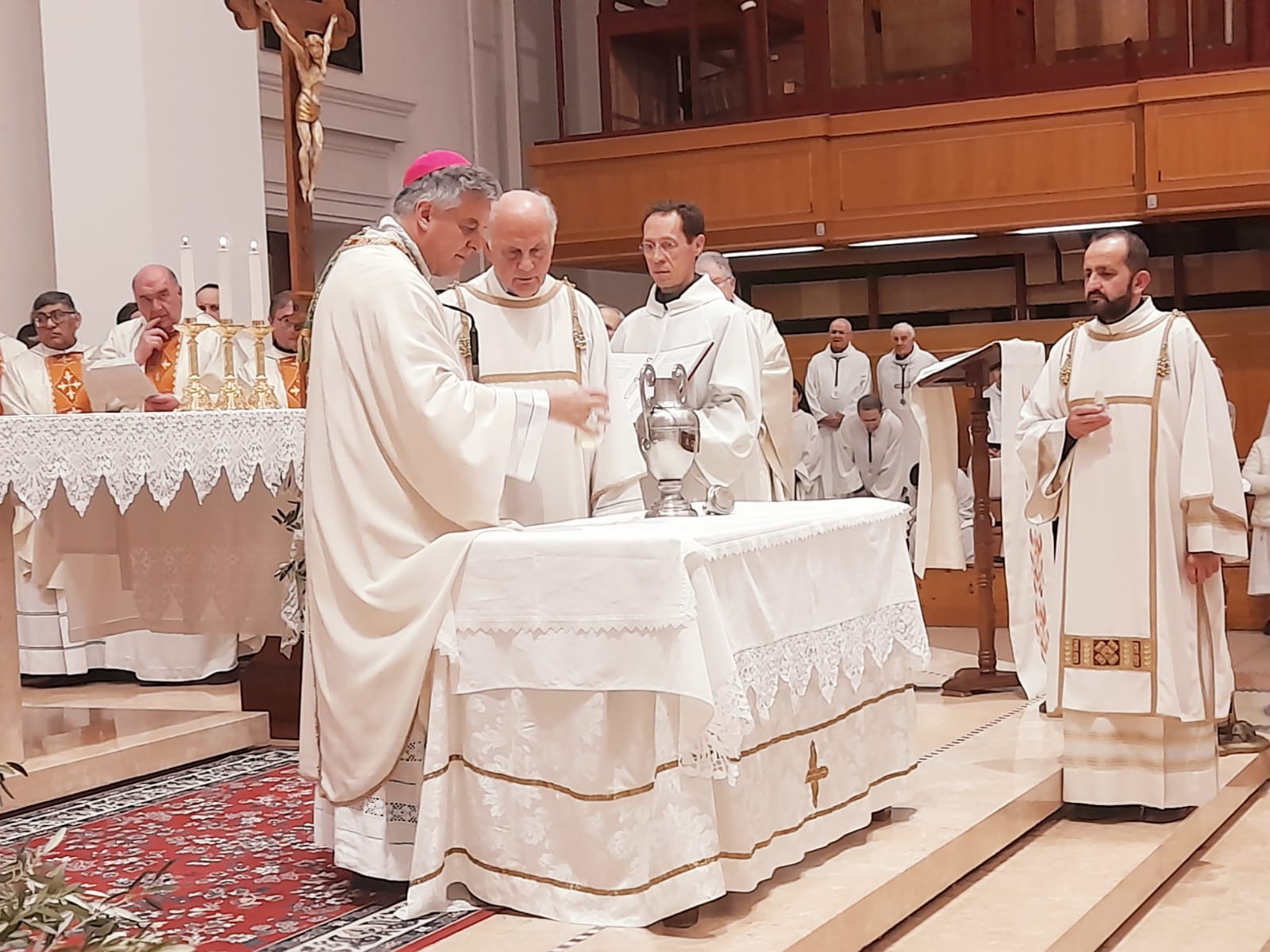 Infine è stato benedetto il crisma, affinché “coloro che ne riceveranno l’unzione siano interiormente consacrati e resi partecipi della missione di Cristo Redentore”. Il crisma è infatti l’olio, misto a profumo, che viene utilizzato nei Sacramenti del Battesimo, della Confermazione e dell’Ordine. Il vescovo Palmieri ha poi compiuto il gesto molto significativo del soffio sul crisma, spiegando: “Come Gesù nel giorno di Pasqua soffia lo Spirito Santo sugli apostoli, così adesso soffierò sull’olio misto a profumo, perché possa essere consacrato dallo Spirito”.