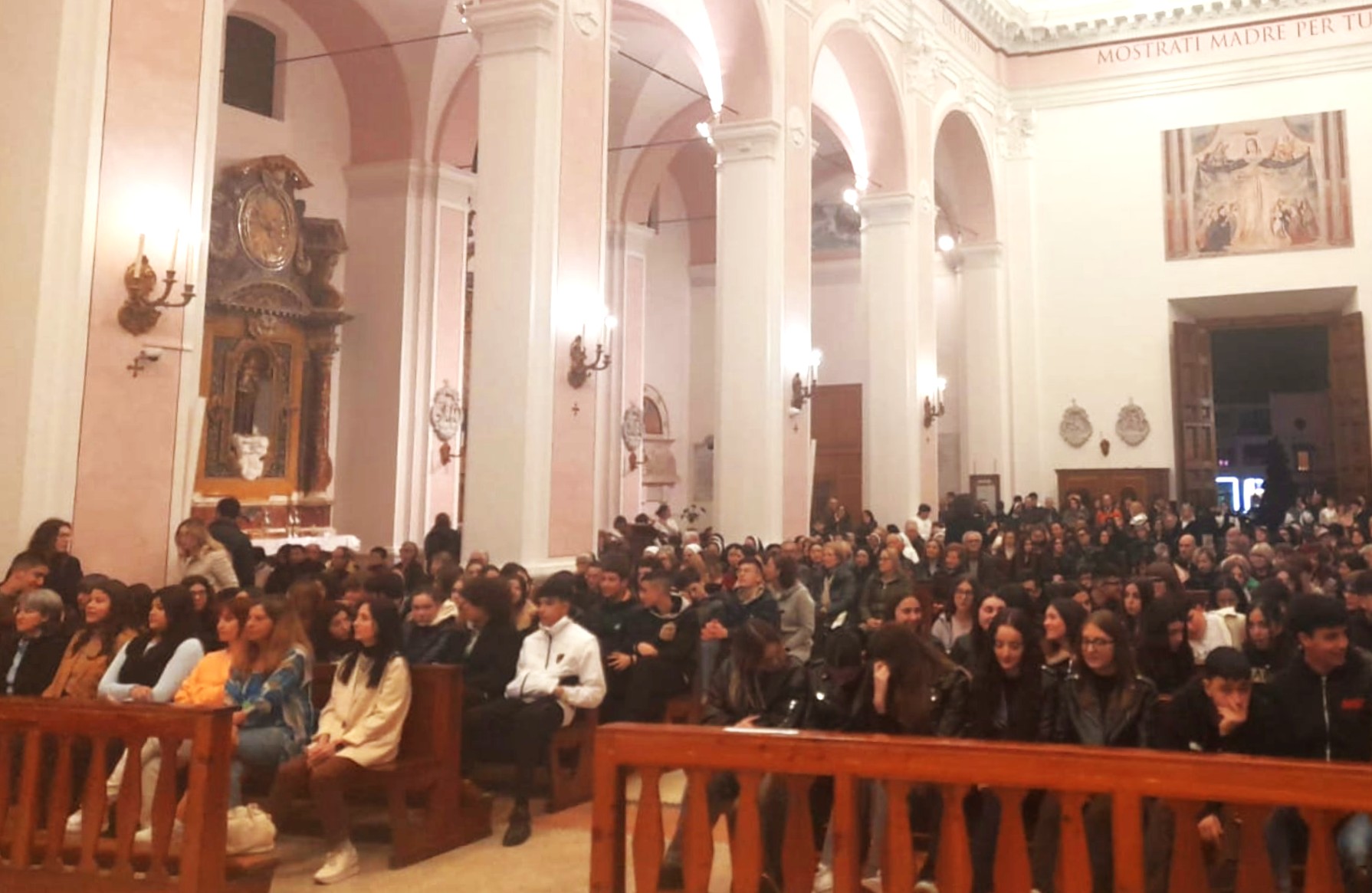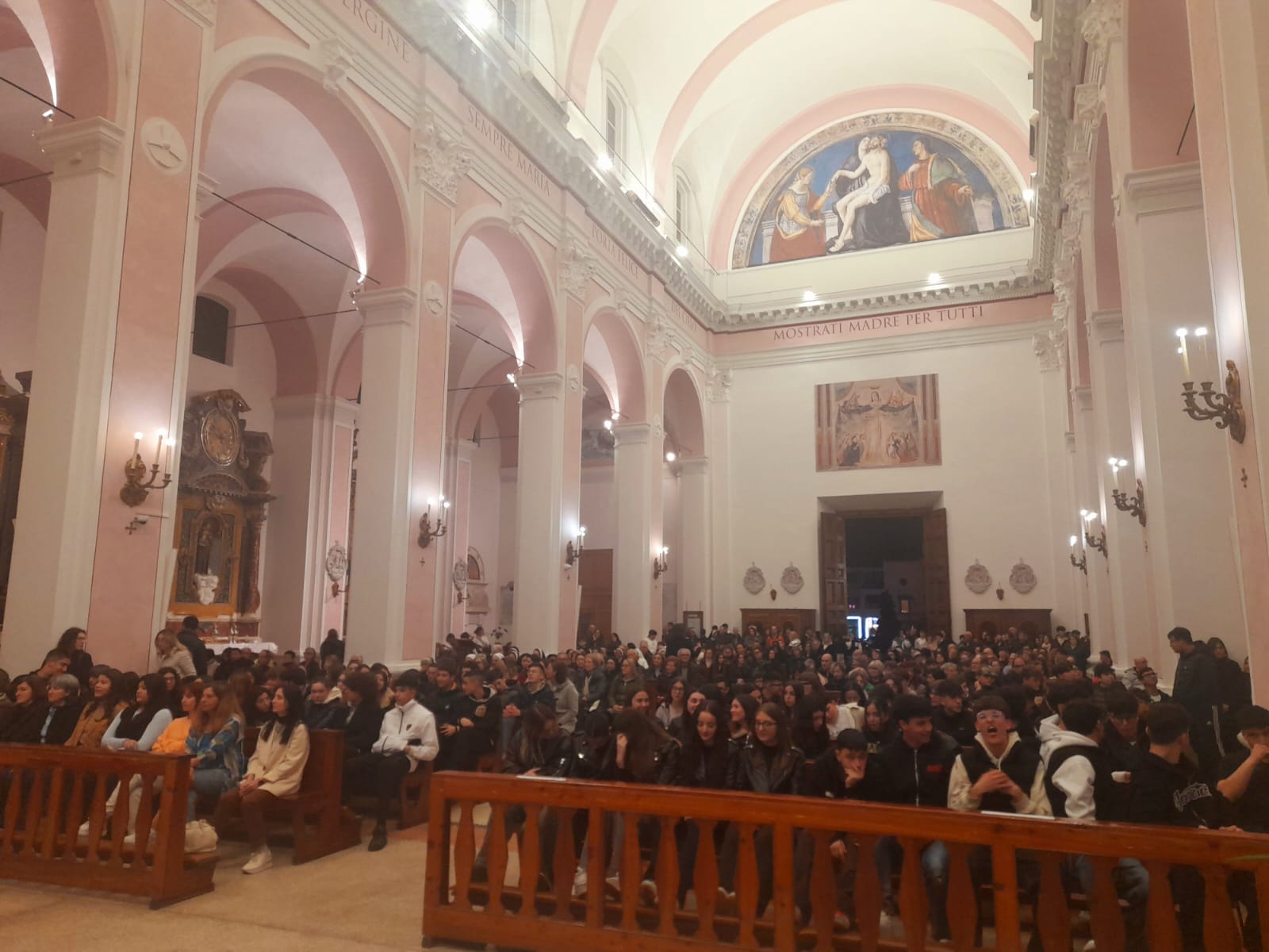 Queste le parole di mons. Palmieri durante l’omelia: “Carissimi fratelli, in modo particolare carissimi voi ragazzi che siete venuti così numerosi stasera e carissimi voi presbiteri e diaconi, sapete che oggi è un po’ la festa dei presbiteri. I vostri preti stasera rinnoveranno le loro promesse al sacerdozio: sarà un momento molto solenne. Vorrei allora sottolineare che questa liturgia ci dà un’emozione grande. Sapete, ragazzi, qual è il rischio più grande che correte? Quello di pensare che dentro di voi ci sia soltanto il vuoto dei vostri pensieri, dei vostri stati d’animo, soprattutto quei pensieri che si ripetono ossessivamente dentro di voi, in particolare il pensiero che in fondo in fondo siete soli. Questa Messa invece ci dice che questo è un errore dell’illusione, che nel più profondo del nostro mondo interiore noi non siamo soli, bensì abbiamo lo Spirito Santo. Per tutte le occasioni in cui noi facciamo i conti con noi stessi e magari ci lasciamo andare alla disperazione, all’illusione che in fondo siamo soli, questa Messa ci ricorda che non è così, che non siamo soli, che abbiamo lo Spirito Santo, che dentro di noi abita Dio. Ecco perché Gesù nel suo primo discorso, quello che abbiamo ascoltato oggi nel Vangelo e che fa nella sinagoga di Nazareth, prende il brano di Isaia e dice: ‘Lo Spirito del Signore è su di me’. Ma come sarebbe bello se stasera andassimo a casa e potessimo dire: ‘Lo Spirito del Signore è su di me. Non sono solo! Non sono lasciato solo nei miei pensieri interiori, nei miei pensieri negativi. Lo Spirito del Signore è con me’“.