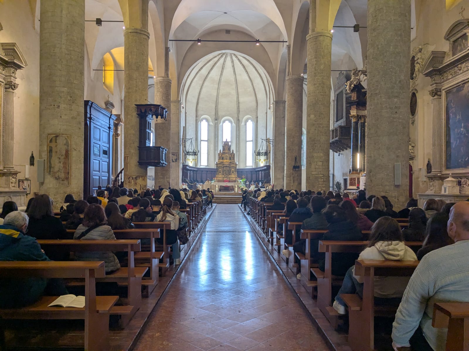Approfittando della mattinata libera dagli impegni scolastici, tantissimi giovani e giovanissimi, in particolare cresimandi, hanno preso posto nelle prime file della splendida chiesa ascolana, accompagnati da un gran numero di fedeli, religiose e, ovviamente, da sacerdoti e diaconi provenienti da tutta la Diocesi, protagonisti di una delle celebrazioni di questa Settimana Santa.