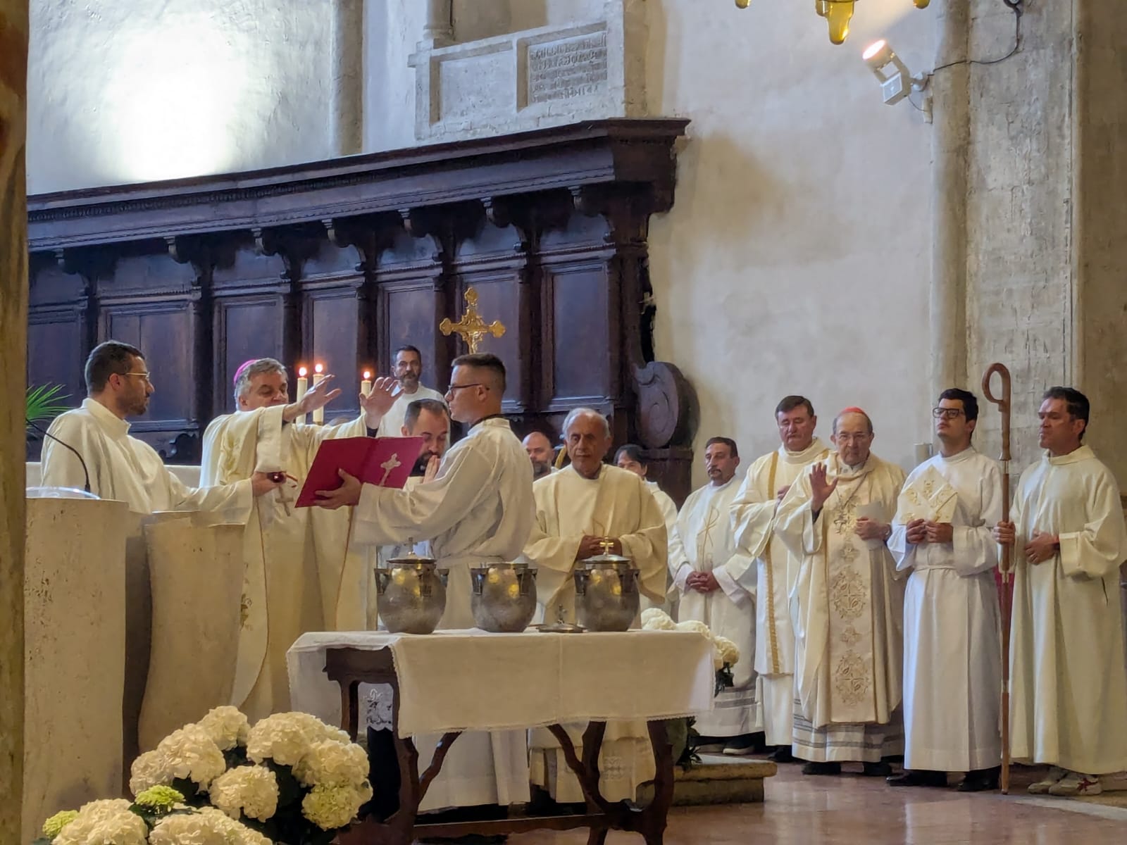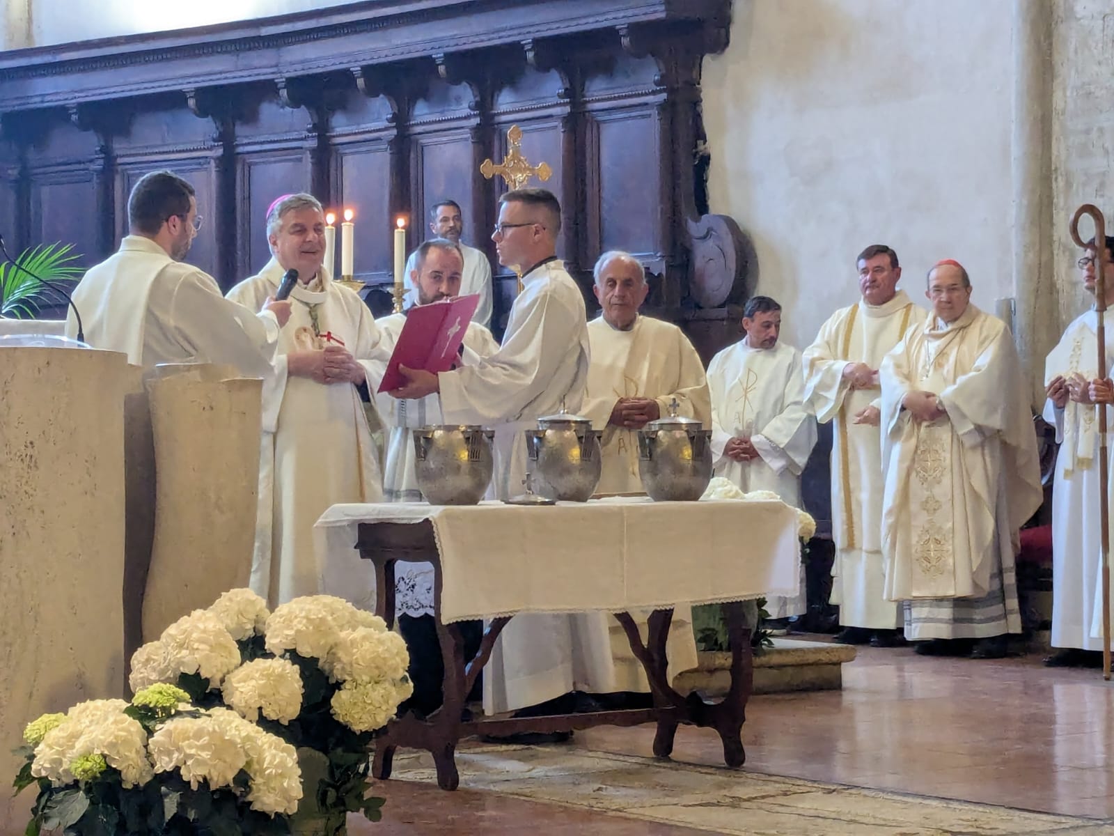 Al termine dell’omelia, insieme ai fedeli riuniti in chiesa e a tutti i presbiteri e diaconi del Piceno, il vescovo Gianpiero ha provveduto a consacrare il crisma, l’olio dei catecumeni e l’olio degli infermi. Il soffio del nostro vescovo, accompagnato dalle mani di tutti i sacerdoti, sancisce la benedizione degli oli sacri destinati ai sacramenti e il rinnovo delle promesse sacerdotali del clero ascolano, in un momento di profonda unità per tutta la comunità cristiana del Piceno.