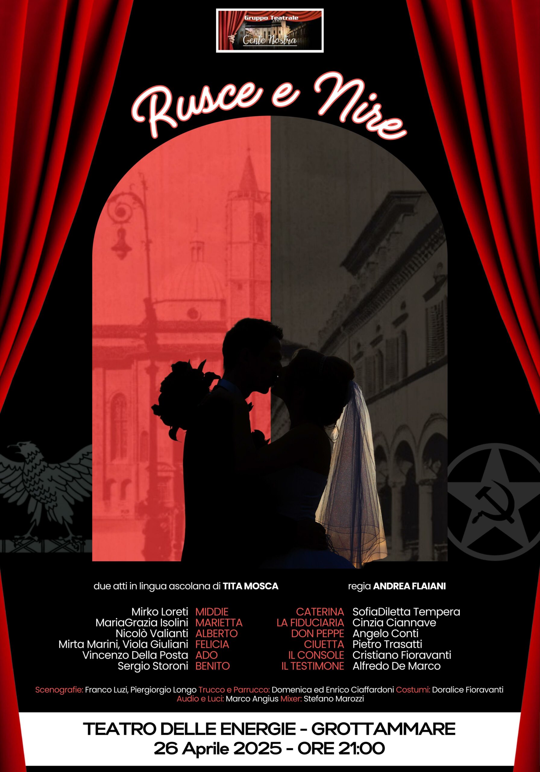 “Rusce e Nire” è una commedia in dialetto ascolano della compianta scrittrice Tita Mosca, rappresentata per la prima volta dalla compagnia teatrale “Gente Nostra” di Ascoli Piceno nel lontano 2009 per la regia di Guido Mosca. A distanza di 16 anni, la compagnia ripropone, con Andrea Flaiani alla regia, questa divertente storia del calzolaio ascolano Middio “Caporosso”, comunista sfegatato, costretto dalla sorte a vivere il ventennio fascista e a confrontarsi quotidianamente con gli aspetti farseschi dell’una e dell’altra parte. Il sipario si apre ad Ascoli la mattina di un 28 ottobre sul finire degli anni ’30, ricorrenza della marcia su Roma: giornata di parate, bande musicali, marce, saggi ginnici e in cui le scarpe hanno una valenza fondamentale. A Middio non basteranno né la sua venerazione del quadro di “Baffò” (Stalin), che tiene appeso alle sue spalle, né l’opera mediatrice di sua moglie Marietta per evitare di contaminarsi col mondo che lo circonda, anzi: sarà proprio la sua amata figlia Caterina, “giovane italiana” della prima ora che, innamorandosi di Benito, novello “controllore della milizia”, sospingerà forzatamente il malcapitato tra le braccia del regime attraverso una serie di accadimenti e intrecci esilaranti con un finale affidato…alla provvidenza, ma non troppo!