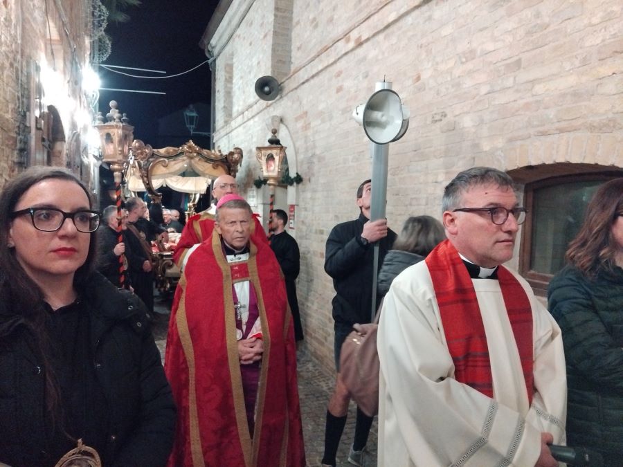A presiedere la funzione è stato S.E.R. Mons. Armando Trasarti, che ha guidato i fedeli lungo il percorso accompagnato da momenti di preghiera, riflessione e canti devozionali eseguiti dal Corpo bandistico “Città di Accumoli”. Alla cerimonia erano presenti anche il sindaco di Acquaviva Picena, Sante Infriccioli, rappresentanti dell’amministrazione comunale e il Comandante della Stazione dei Carabinieri, Maresciallo Domenico Princigalli.
